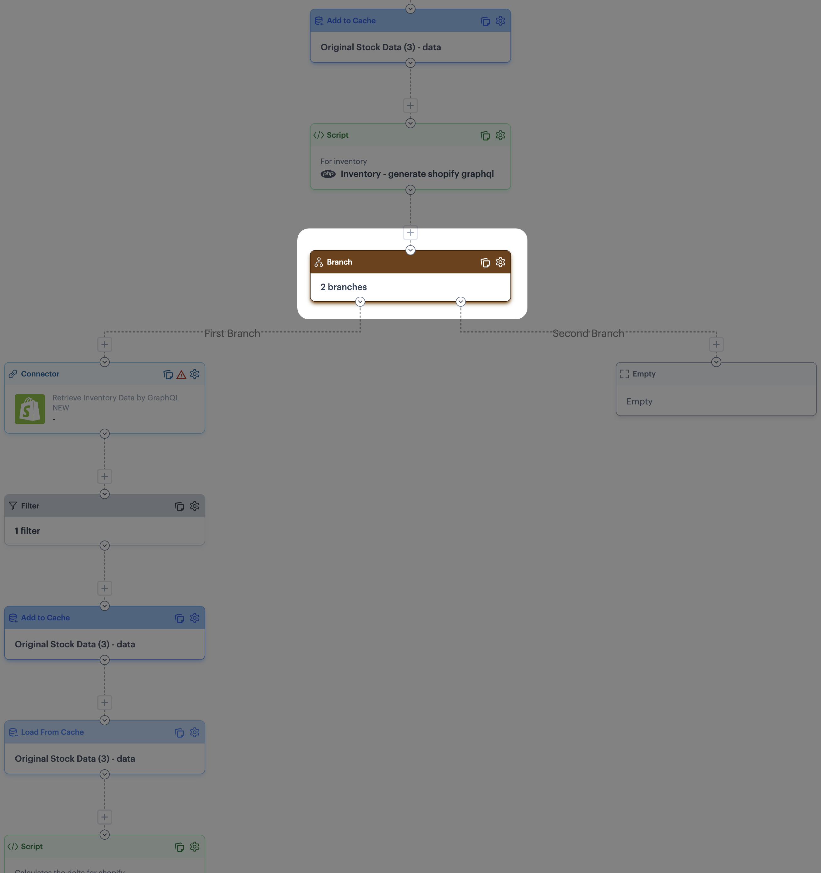Having retrieved inventory data from Shopify, cached data is loaded back into the flow. A script then runs, comparing NetSuite inventory items against Shopify’s inventory data, to determine any quantities that need updating (i.e. Delta values).&#x20;