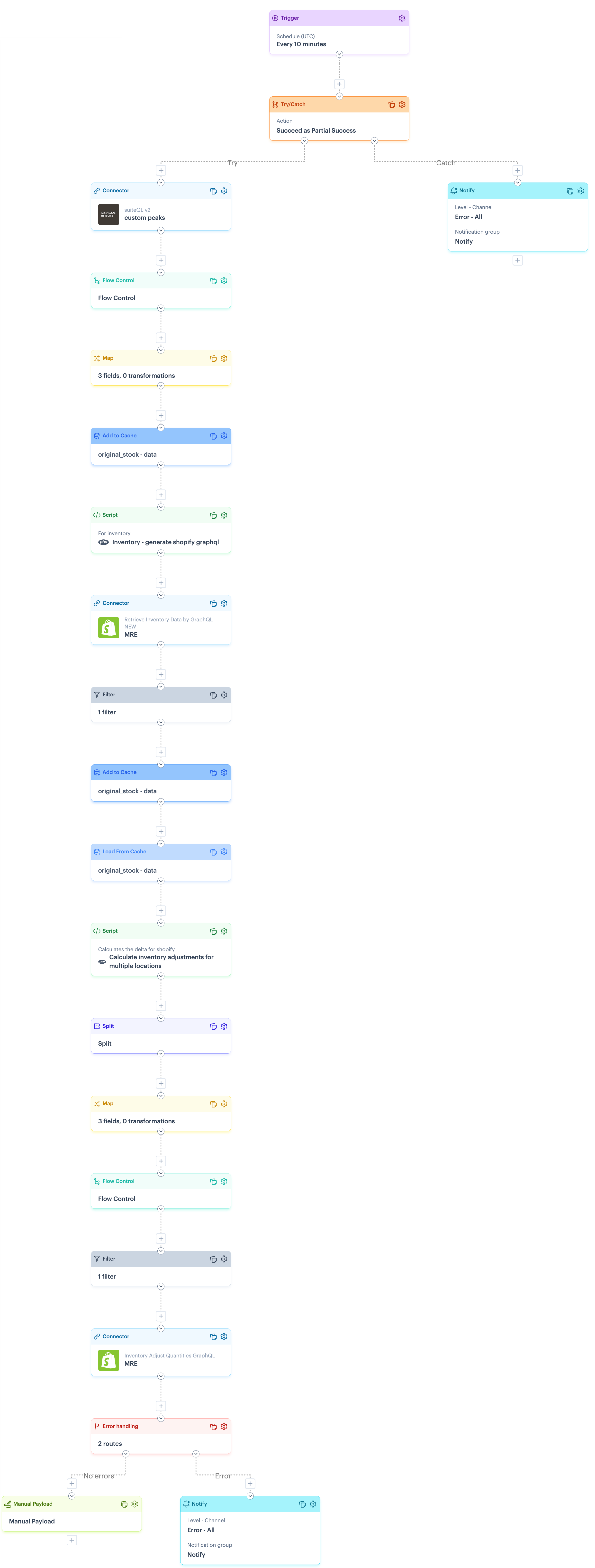 <table data-full-width="false"><thead><tr><th width="165.34375">Shape</th><th>Notes</th></tr></thead><tbody><tr><td>Trigger</td><td><p>The default setting is to run every 10 minutes (recommended) but you can change the schedule if required.</p><p></p><p>Keep in mind that the NetSuite connector includes a query that retrieves items updated within a given lookback period (based on <a href="#flow-variables">flow variables</a>). You should ensure that the trigger schedule aligns with your lookback period.</p></td></tr><tr><td>Notify</td><td>This flow is designed in a try/catch structure, so notifications are generated if any part of the flow fails. To achieve this, the <code>catch</code> route includes a <a href="../../../../process-flows/building-process-flows/process-flow-shapes/standard-shapes/notify-shape">notify shape</a>, which must be configured for your own notification preferences. <br><br><code>Alert level</code>: Defaults to <code>error</code> but can be changed if needed<br><code>Channel</code>: Defaults to <code>email + log</code> but can be changed if needed<br><code>Email Limit</code>: Defaults to <code>5</code> but can be changed if needed<br><code>Notification Group</code>: Replace the <code>notify</code> placeholder which your required notification group. <br><code>Message</code>: If required, you can change the placeholder message.<br><br>For more information, please refer to our <a href="../../../../process-flows/building-process-flows/process-flow-shapes/standard-shapes/notify-shape">Notify shape</a> and <a href="../../../../general-settings/notification-groups">Notification groups</a> pages.</td></tr><tr><td>Connector (NetSuite)</td><td>If you did not add or select a NetSuite instance during the blueprint <a href="../installation-guide-shopify-and-netsuite/stage-4-install-the-blueprint-shopify-and-netsuite">installation process</a>, the following settings must be configured:<br><br><code>Source instance</code> : Set to your required <code>NetSuite</code> instance.<br><code>Source endpoint</code> :  Set to <code>POST suiteQL</code><br><code>Query</code> : Leave as it defaults. This variable references your <code>datenow</code> and <code>datefrom</code> flow variables to determine the lookback period for updated items. Make sure these <a href="#flow-variables">flow variables </a>are set as required.</td></tr><tr><td>Connector (Shopify)</td><td>If you did not add or select a Shopify instance during the blueprint <a href="../installation-guide-shopify-and-netsuite/stage-4-install-the-blueprint-shopify-and-netsuite">installation process</a>, the following settings must be configured:<br><br><code>Source instance</code> : Set to your required <code>Shopify</code> instance.<br><code>Source endpoint</code> :  Set to <code>POST Retrieve inventory data by graphql</code></td></tr><tr><td>Split</td><td>The <code>level to split</code> value must be updated with the name of your NetSuite warehouse location (exactly as it appears in NetSuite).</td></tr><tr><td>Connector (Shopify)</td><td><p>If you did not add or select a Shopify instance during the blueprint <a href="../installation-guide-shopify-and-netsuite/stage-4-install-the-blueprint-shopify-and-netsuite">installation process</a>, the following settings must be configured:</p><p></p><p><code>Source instance</code>: Set to your required <code>Shopify</code> instance.</p><p><code>Source endpoint</code> :  Set to <code>POST Inventory adjust quantities graphql</code>     </p><p><code>Variables</code>: Leave <code>Inventory ID</code> , <code>Delta</code>, and <code>Location ID</code> as defaults.</p></td></tr><tr><td>Error handling route</td><td>This flow includes a <code>route</code> shape named <code>error handling</code>, with routes designed to provide additional error handling. You can update the notify shape as required. <br><br>Note that this route shape relates to the <a href="#limitations">Shopify GraphQL limitation</a> noted above. This same route shape can be applied wherever you feel appropriate in process flows. </td></tr></tbody></table>