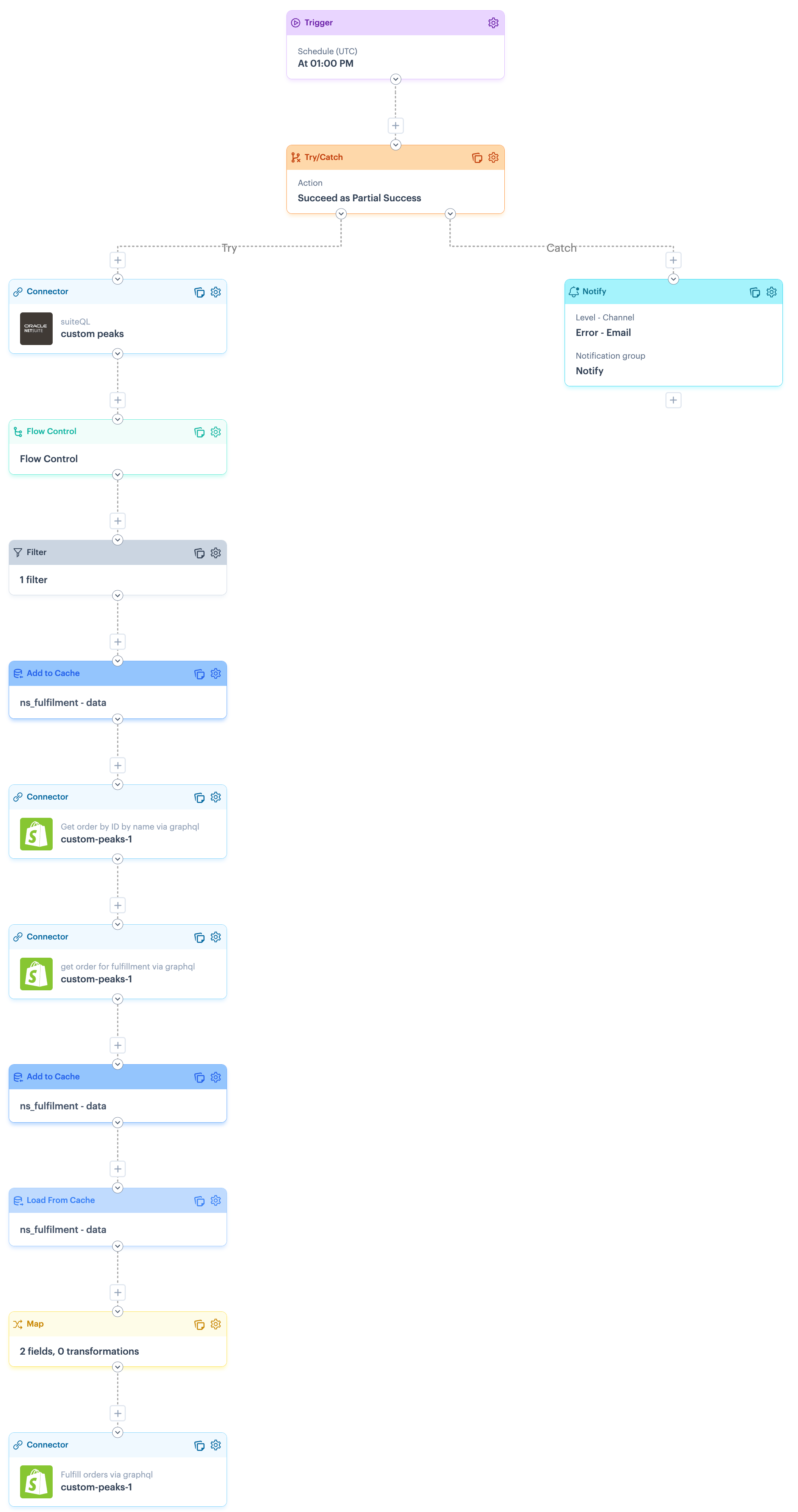 This flow is designed in a try/catch structure, so notifications are generated if any part of the flow fails. To achieve this, the catch route includes a notify shape, which must be configured for your own notification preferences.
