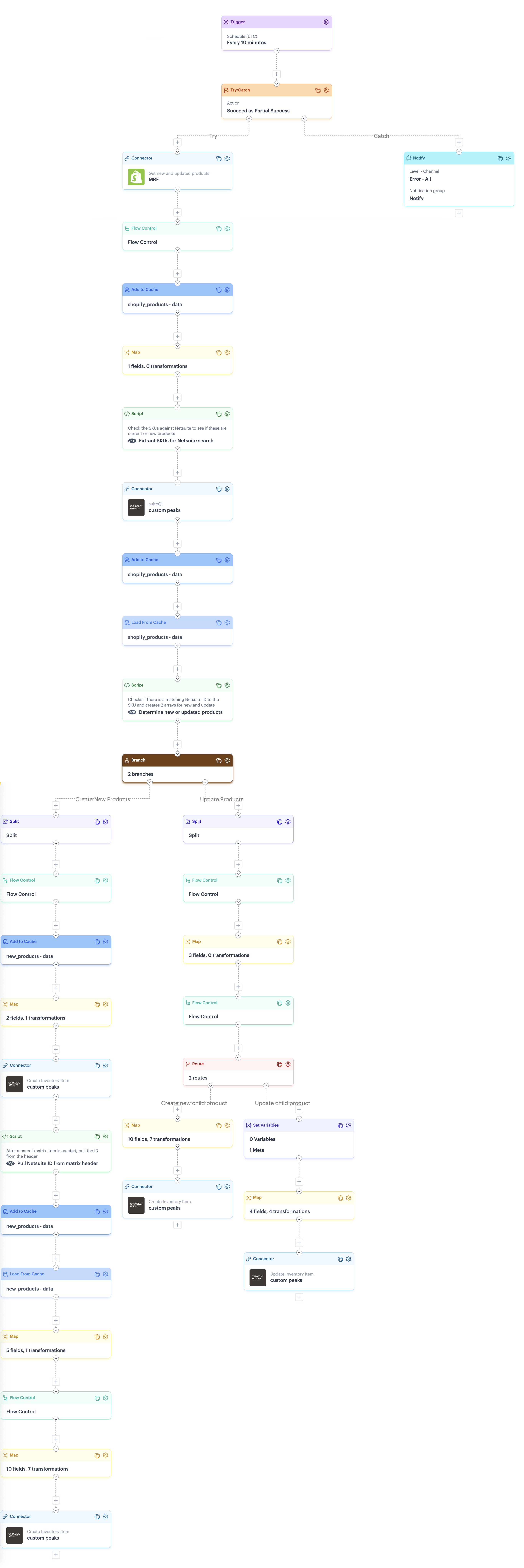This flow is designed in a try/catch structure, so notifications are generated if any part of the flow fails. To achieve this, the catch route includes a notify shape, which must be configured for your own notification preferences.