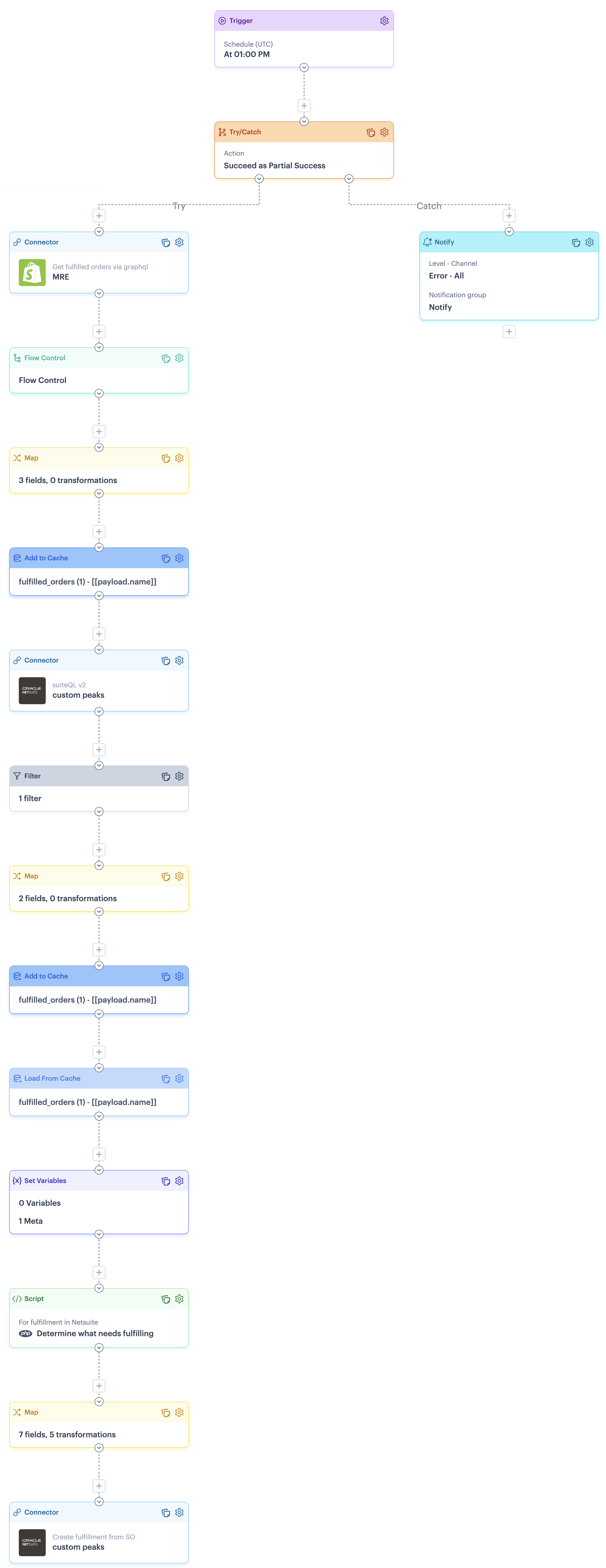 This flow is designed in a try/catch structure, so notifications are generated if any part of the flow fails. To achieve this, the catch route includes a notify shape, which must be configured for your own notification preferences.