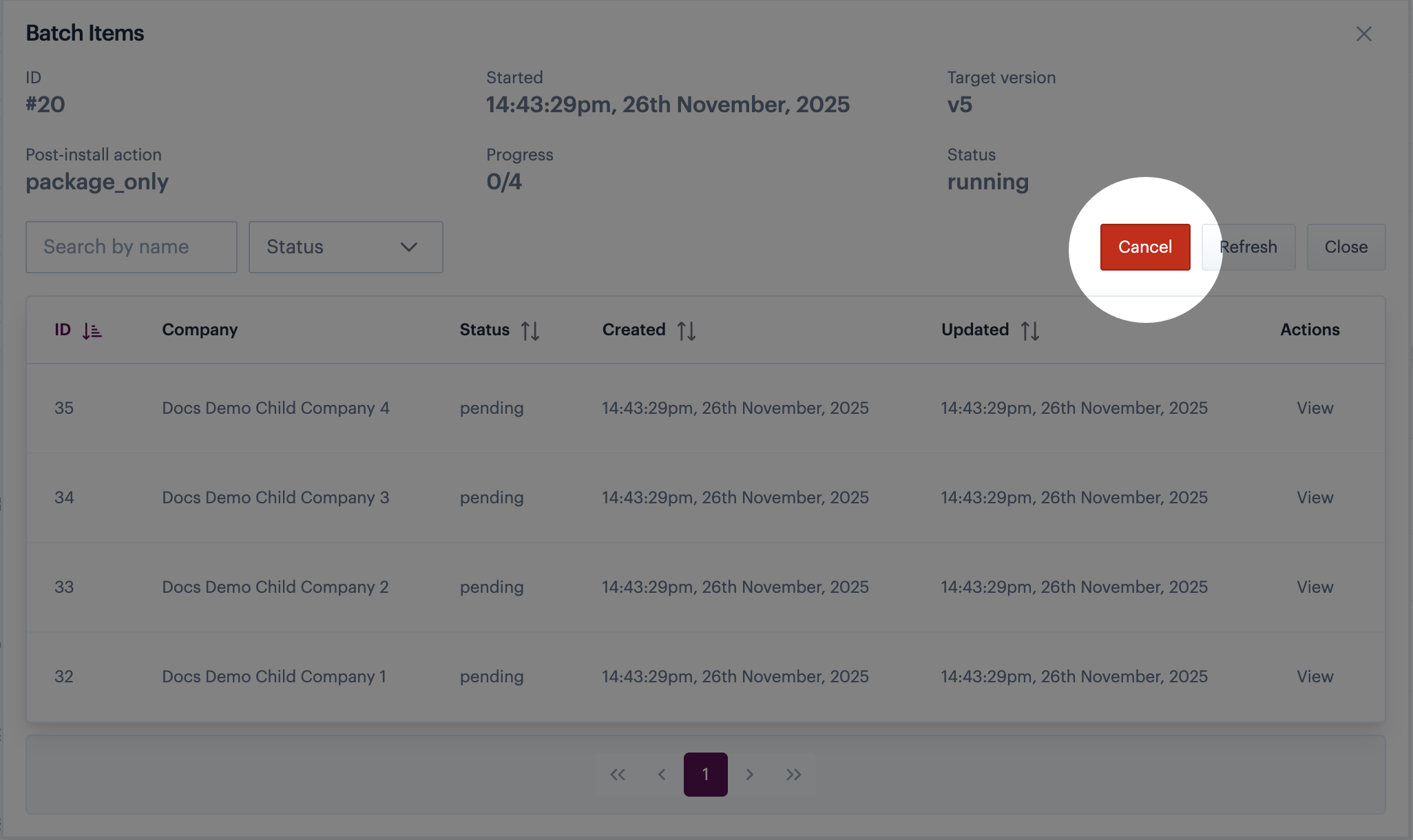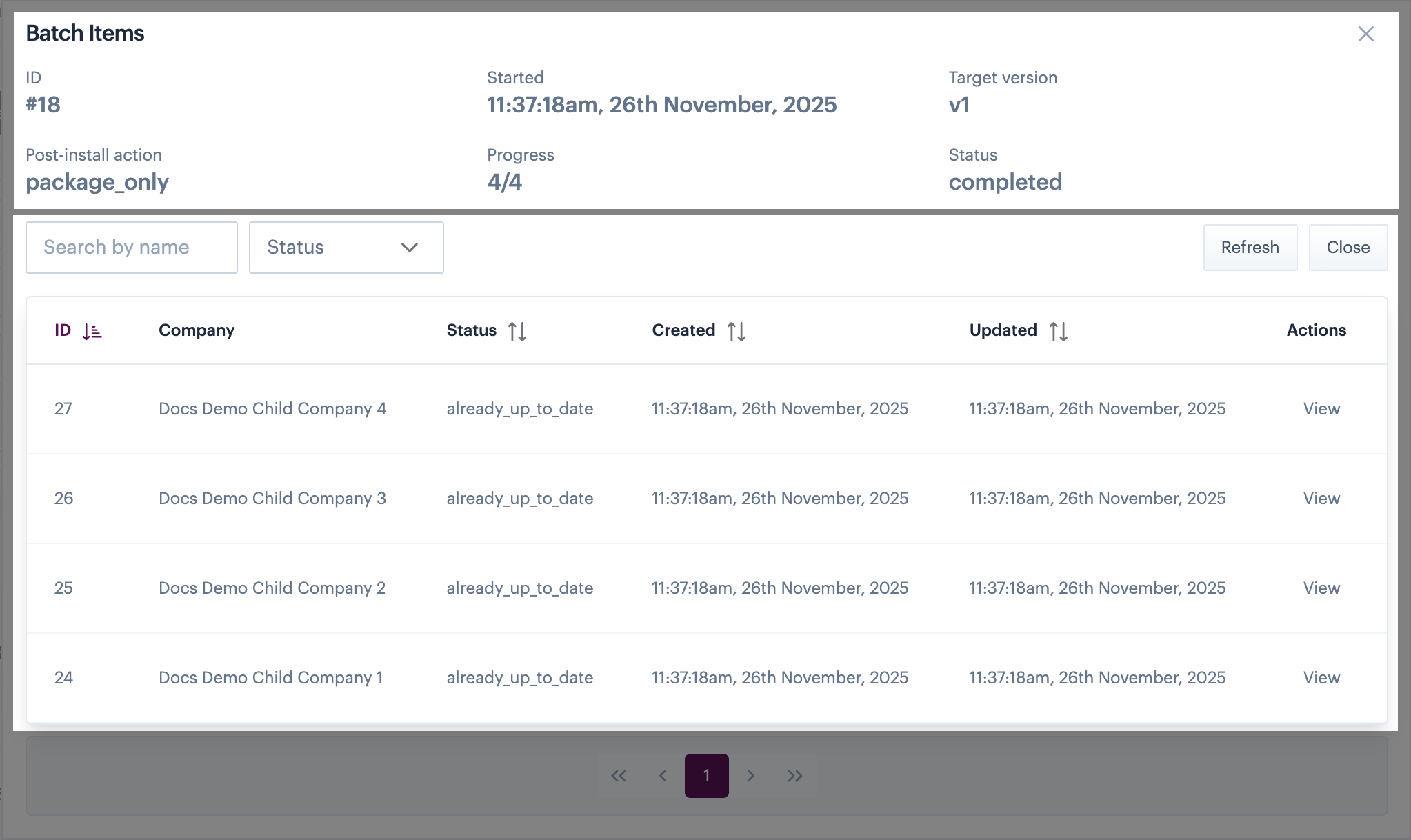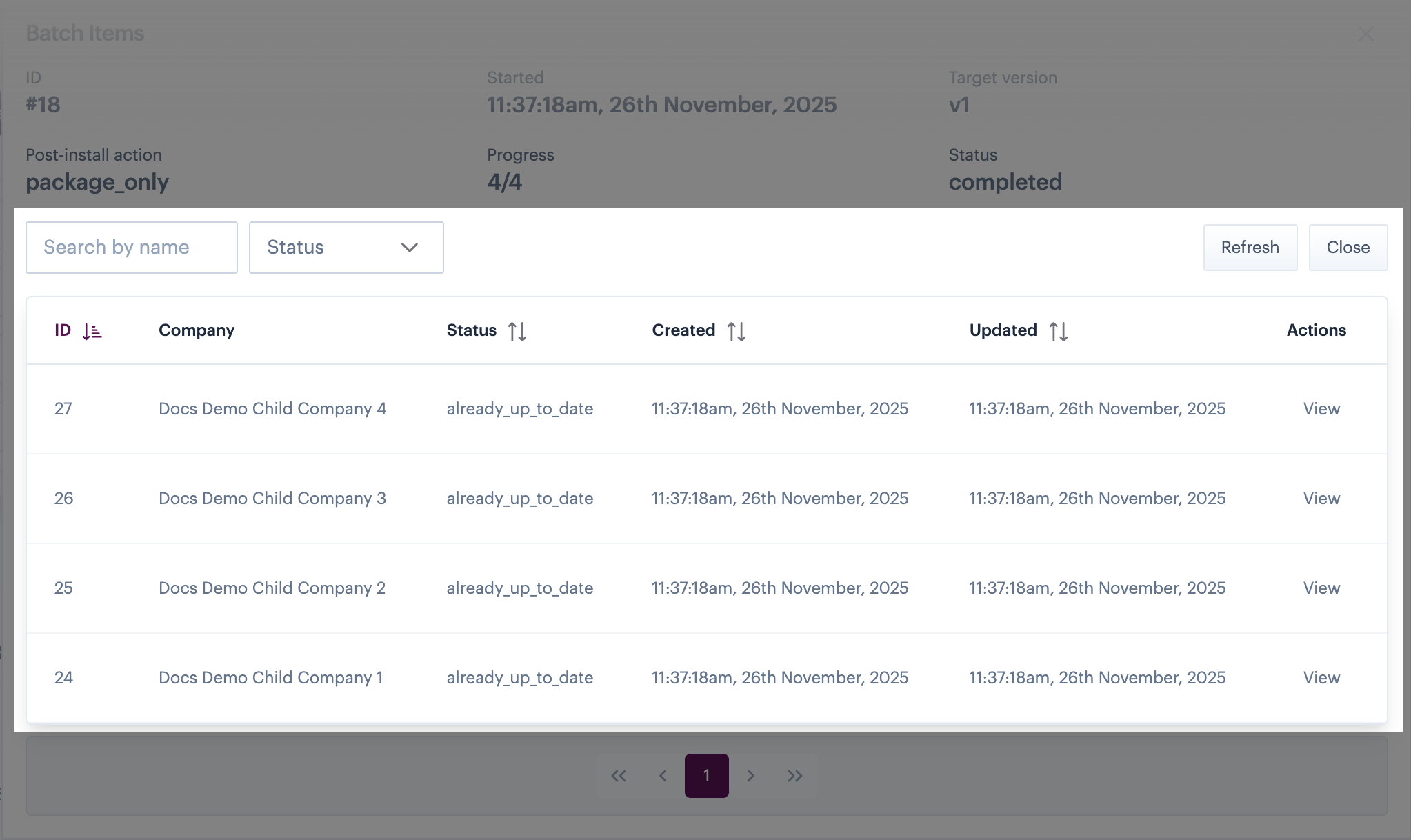 <table><thead><tr><th width="264.71484375">Item</th><th>Summary</th></tr></thead><tbody><tr><td>Search by name</td><td>Search for a specific installation/company by name or partial name (the search is not case sensitive).</td></tr><tr><td>Status filter</td><td>Use the dropdown list to filter the list of updates by current status.</td></tr><tr><td>Refresh</td><td>If a bulk update is running, information in this panel may change. Use the refresh button to update this page (including the <a href="#batch-items-general-details">general details pane</a>).</td></tr><tr><td>Close</td><td>Close this page and exit back to the main <a href="#understanding-the-installs-page">installs page</a>.</td></tr></tbody></table>