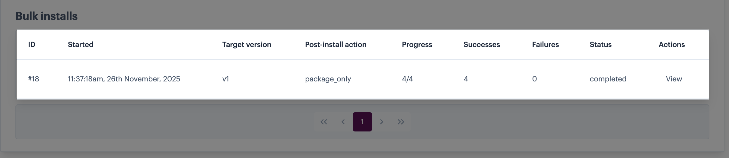 The `bulk installs` panel shows one entry for each bulk update however, you can use the `view` action to drill down for detailed information for each entry: