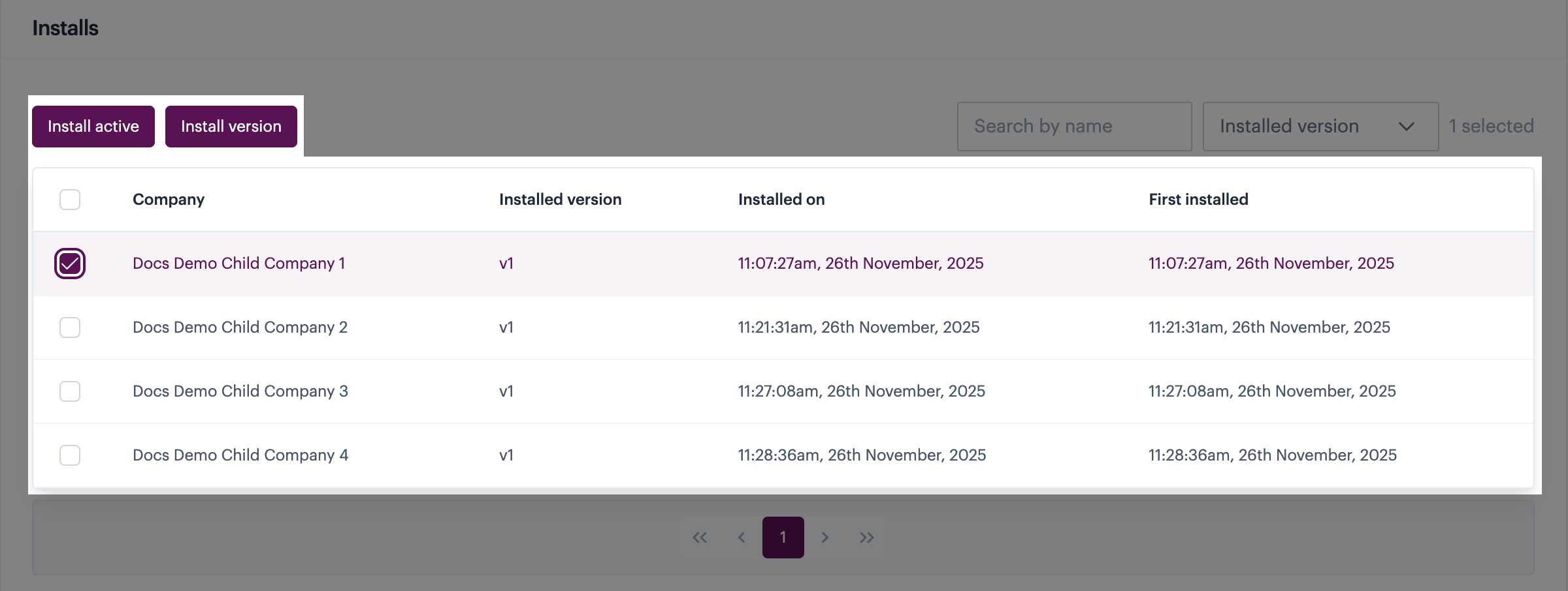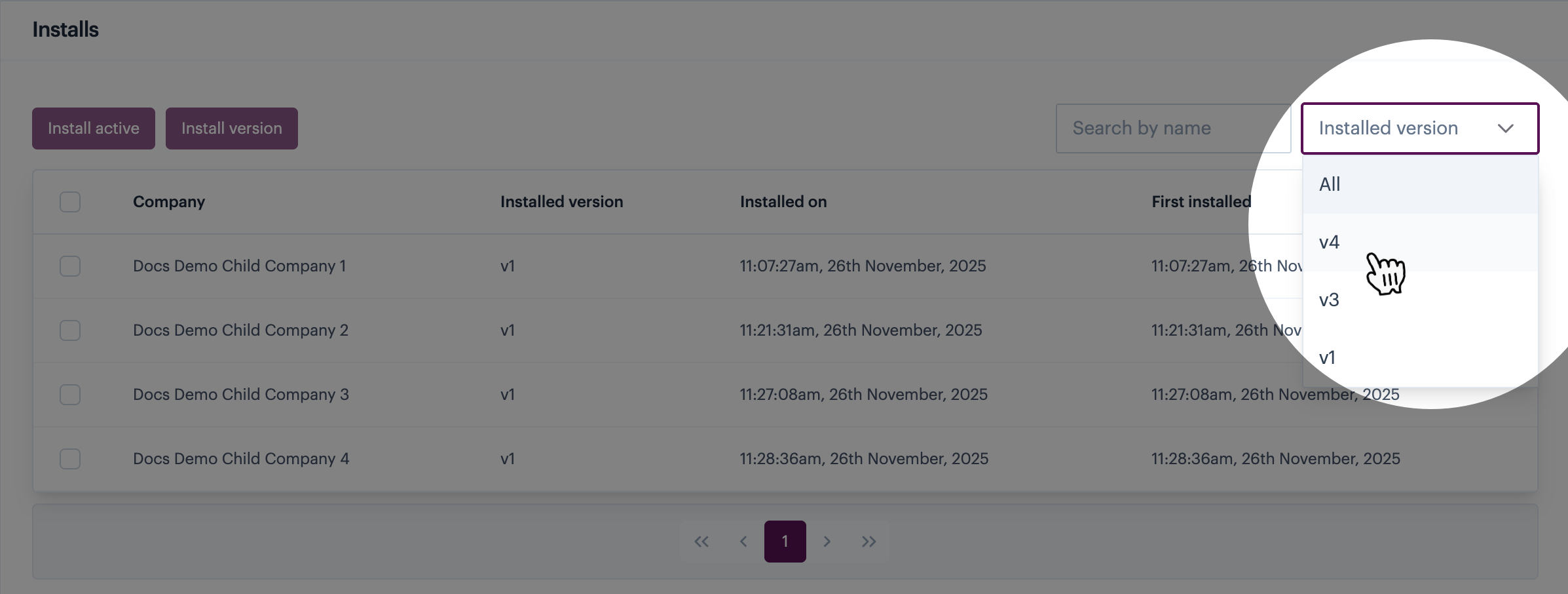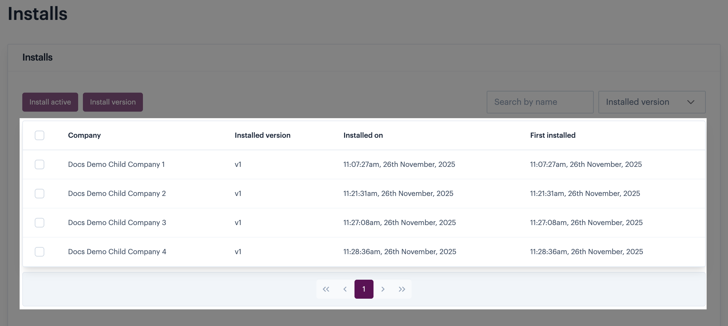 Over time, your list of installations will grow. If necessary, you can use the `search` field to find the installation for a particular company name (or partial company name). You can also filter the list of installations by a selected version.