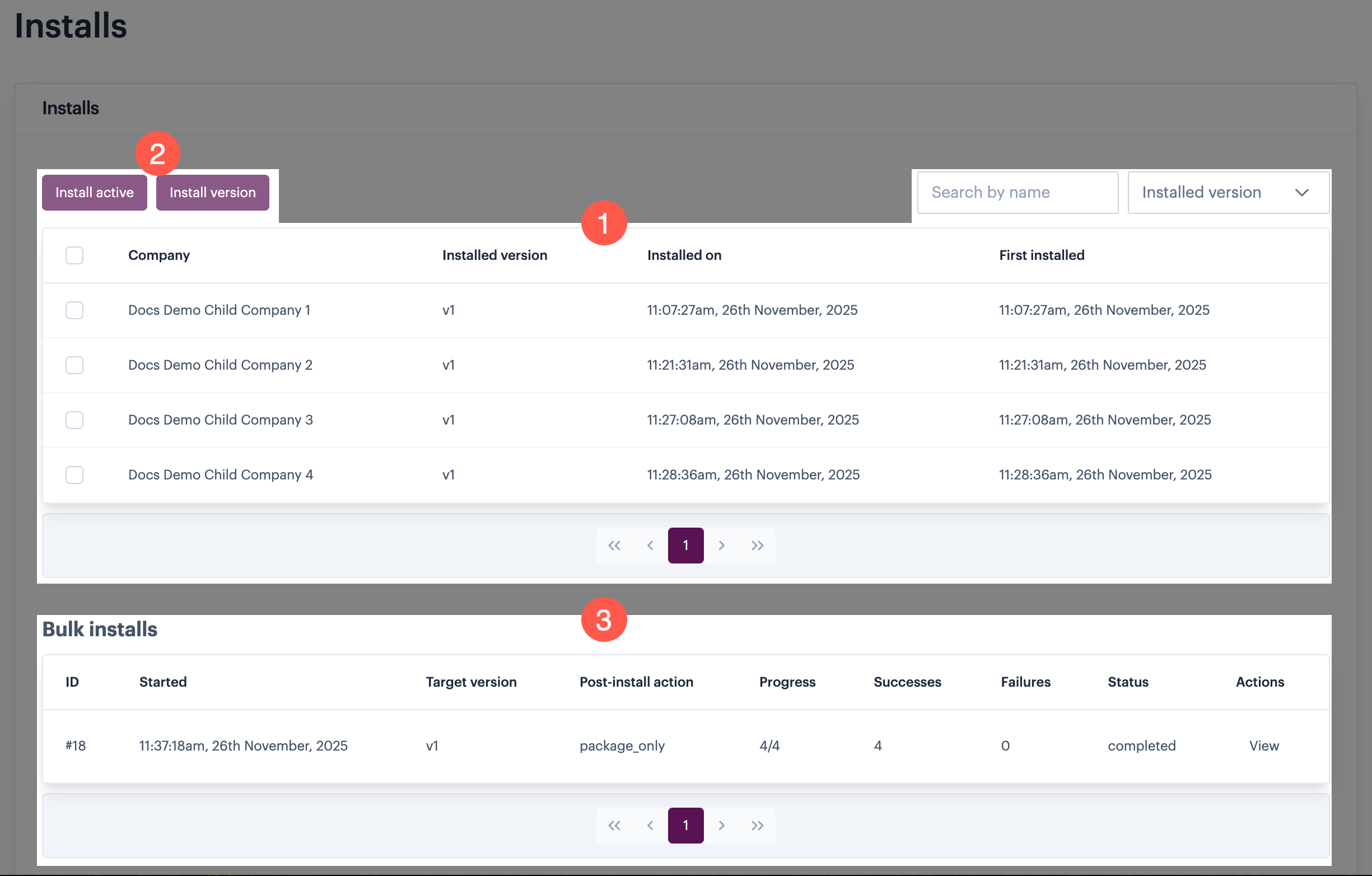 The installs page has three key areas: [**(1)** installs panel](#the-installs-panel); [**(2)** buttons for update actions](#update-actions); [bulk installs panel **(3)**](#the-bulk-installs-panel):
