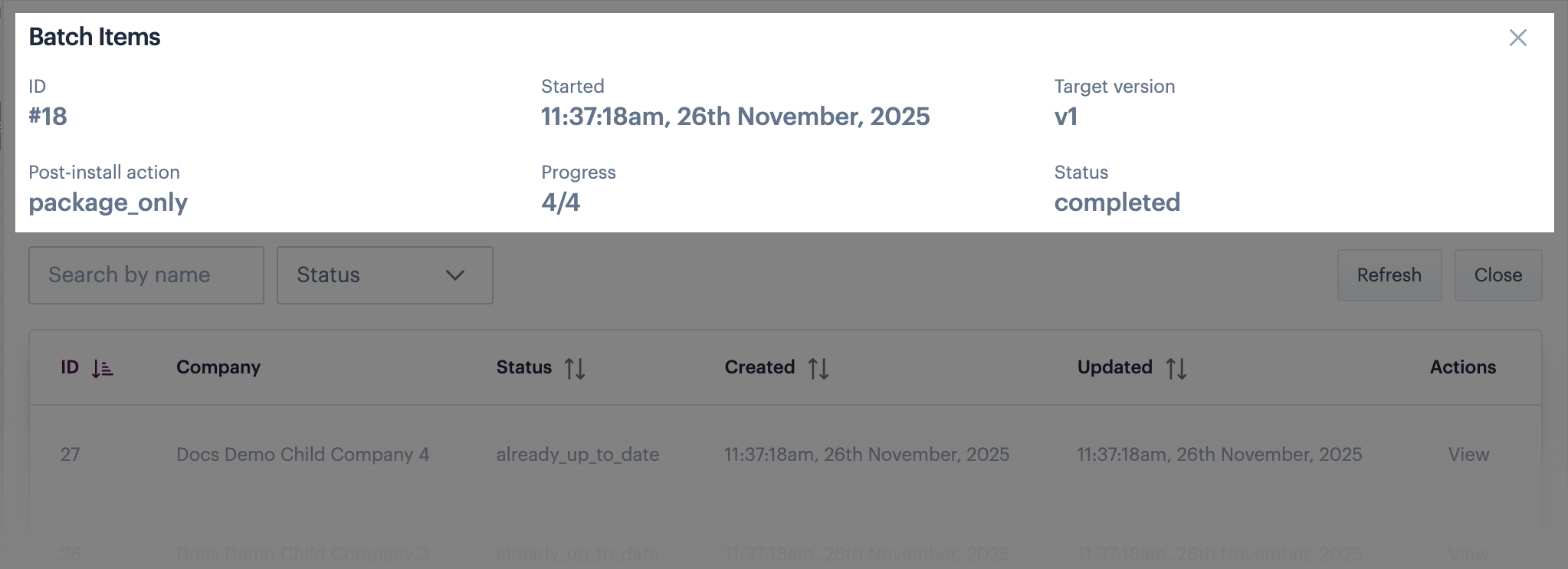 <table><thead><tr><th width="264.71484375">Item</th><th>Summary</th></tr></thead><tbody><tr><td>ID</td><td>The unique ID for the specific update.</td></tr><tr><td>Company</td><td>The company profile selected for update.</td></tr><tr><td>Status</td><td><p>When a bulk update runs, each specific update has its own status. This will be set to one of the following values:</p><ul><li><code>pending</code> (update has not started)</li><li><code>processing</code> (update is in progress)</li><li><code>installed</code> (update completed successfully)</li><li><code>already_up_to_date</code> (the version selected for installation was found to be installed already)</li><li><code>cancelled</code> (the <a href="#cancelling-pending-updates">user cancelled this update</a> when it was pending)</li></ul></td></tr><tr><td>Created</td><td> The date and time that the bulk update was triggered.</td></tr><tr><td>Updated</td><td> The last time this specific installation was updated.</td></tr><tr><td>Actions</td><td><p>Click the <code>view</code> option to view more details (including any error messages) for the associated update. For example:</p><p></p><p><img src="https://2440044887-files.gitbook.io/~/files/v0/b/gitbook-x-prod.appspot.com/o/spaces%2FLYNcUBVQwSkOMG6KjZfz%2Fuploads%2FiDtfWXJ6friwK6l3VoT3%2Fview%20install%20details%20-%20batch%20items%20with%20error.png?alt=media&#x26;token=c8e863a7-66d6-4f08-9ac2-36ba9637be3e" alt=""></p><p></p><p>Errors are unlikely, but if they do occur, the most likely cause is a configuration anomaly.  </p></td></tr></tbody></table>