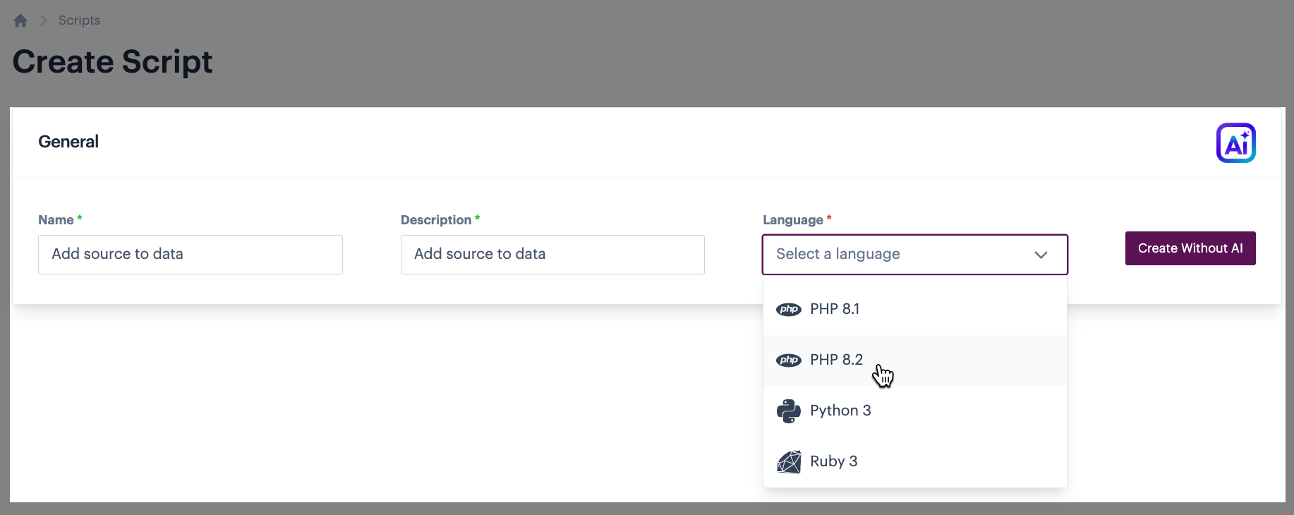 The Patchworks AI panel is displayed below as soon as your coding language is selected in the previous step. Please see Creating a script with AI for information about these options.