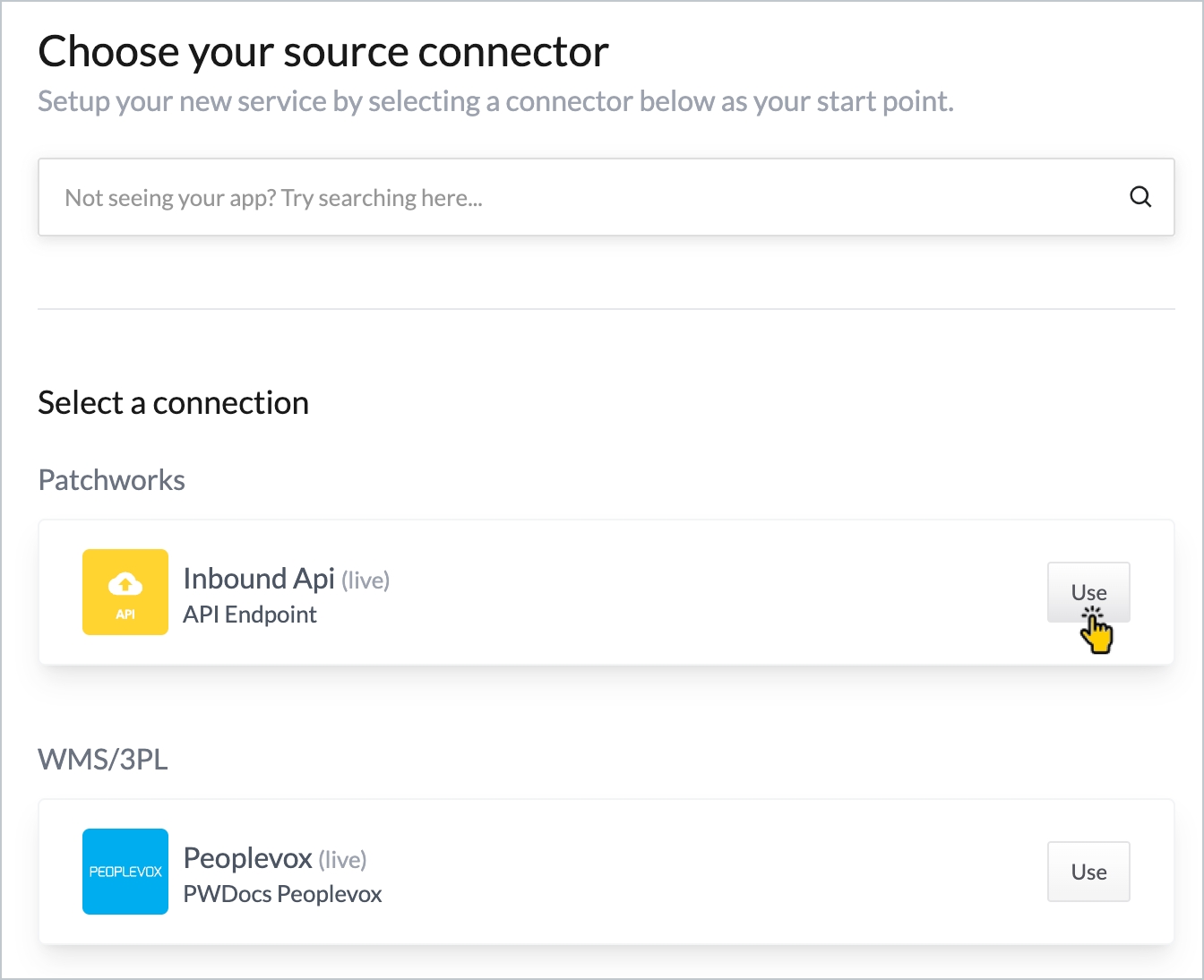 Step 3 When prompted to choose a source connector (all configured connectors for your implementation are listed), select the Inbound API connector: