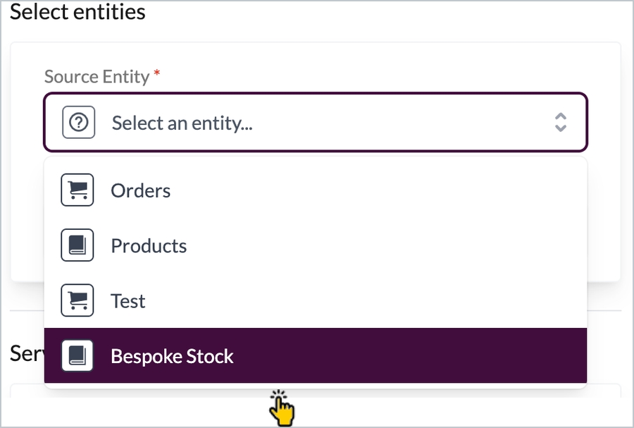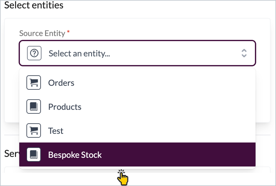 Step 1 Click the source entity dropdown field and select the custom entity that you created earlier: