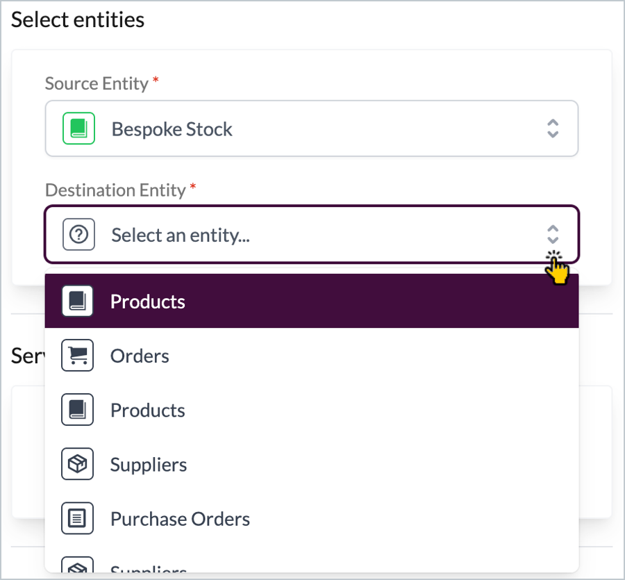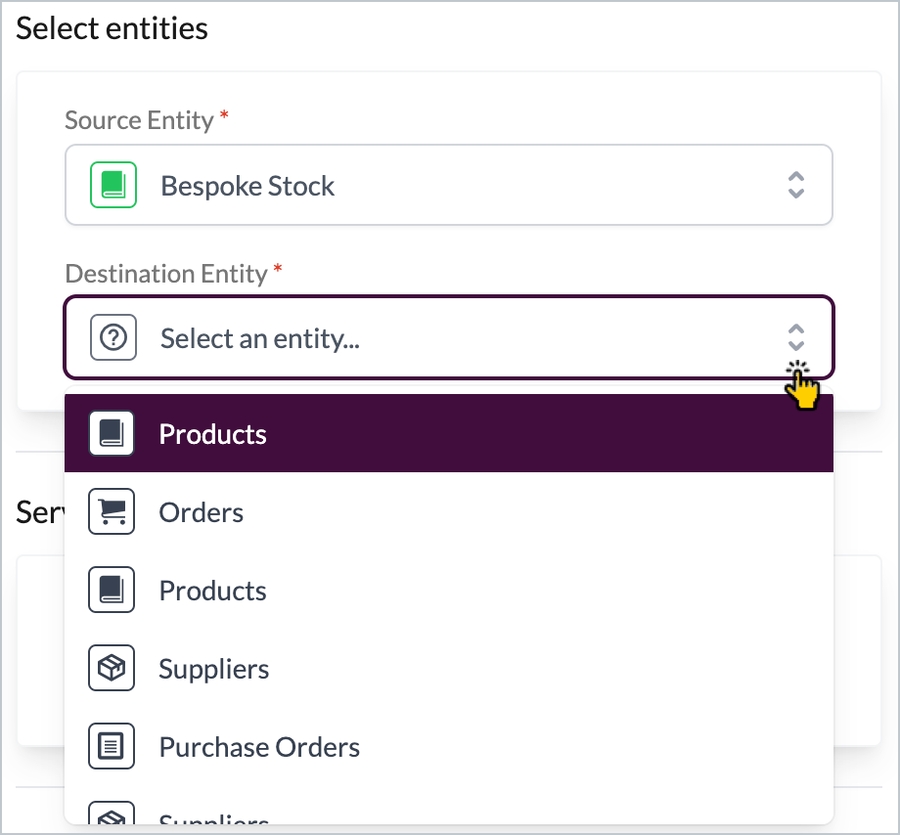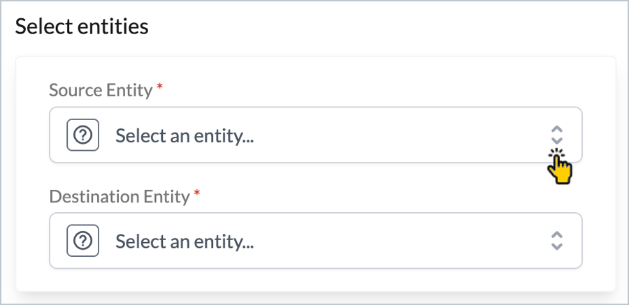 Step 2 Click the destination entity dropdown field and select which entity should be mapped for the destination connector - for example: