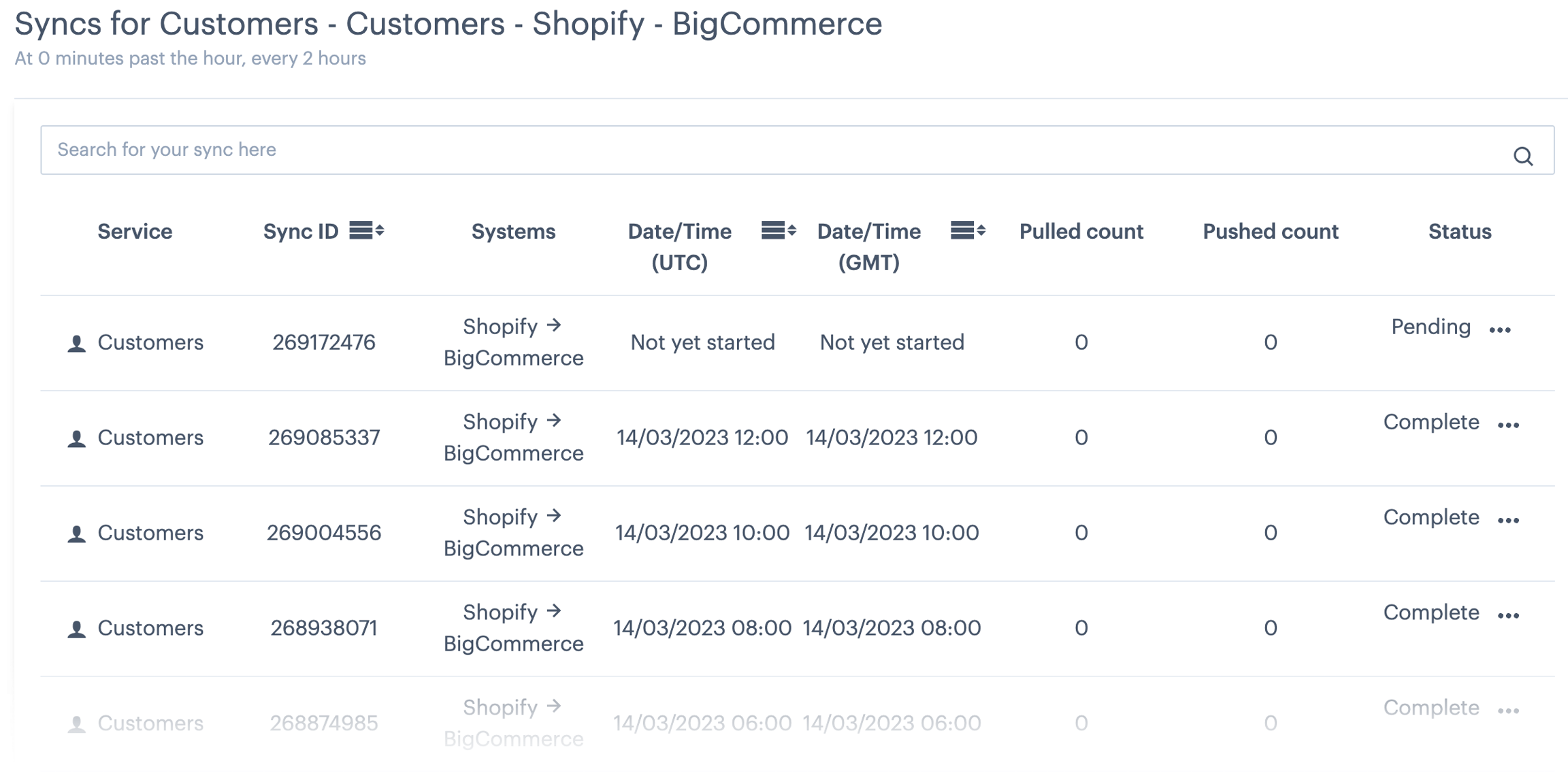 ...the service summary is displayed, showing a list of all syncs - for example: