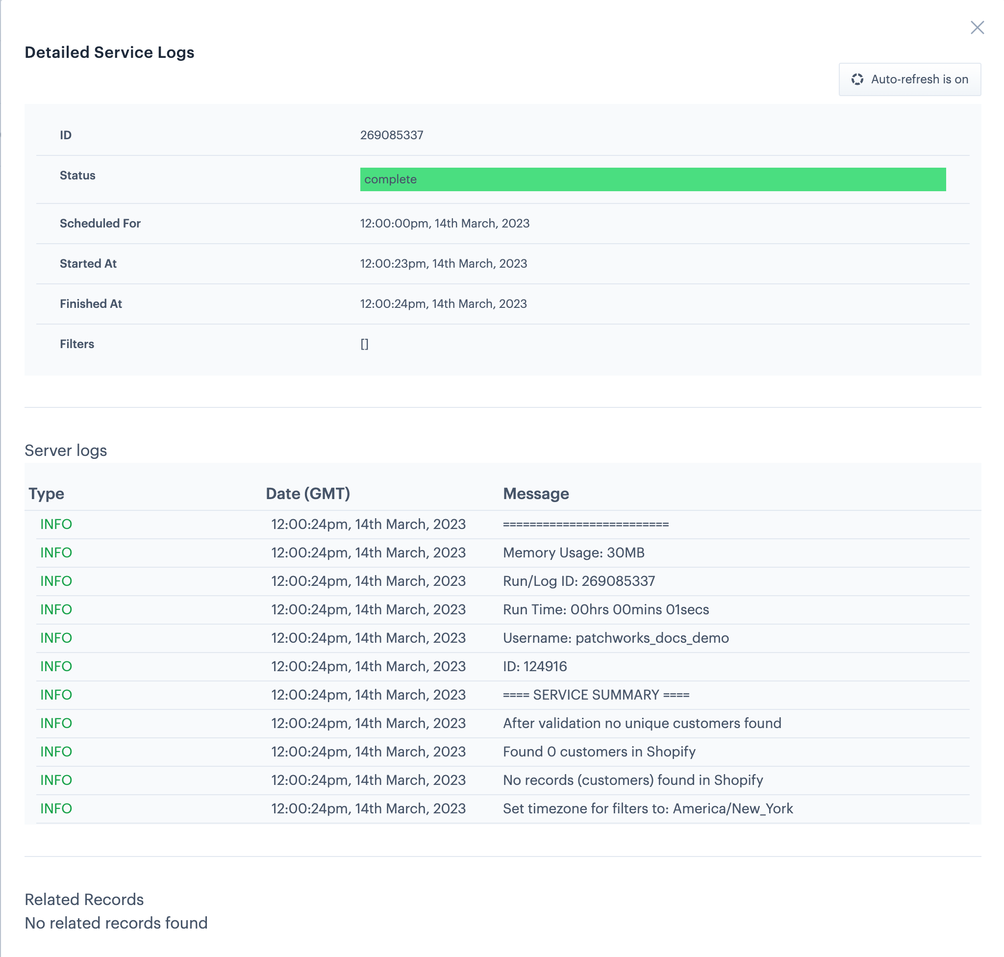 Here, you'll see a line-by-line log for the sync. If you're viewing this log while a sync is running, it auto-refreshes every five seconds, so you have a live view. If required, you can pause the auto-refresh by clicking the auto-refresh is on button (so it toggles to 'off'):