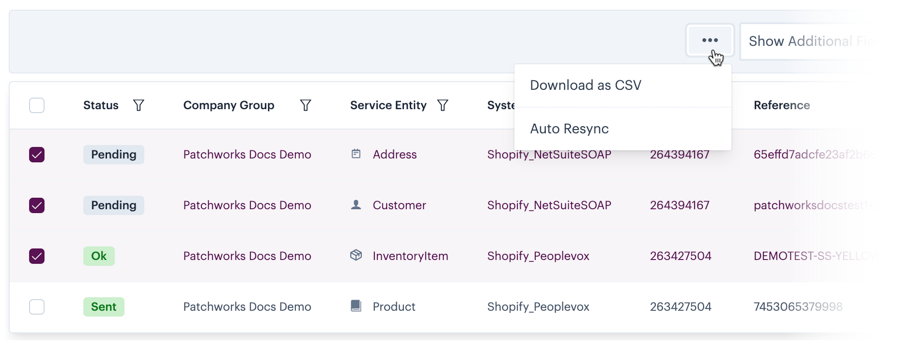 Use checkboxes to select specific entries for an action - typically, a resync. You can select a single entry or multiple entries and then choose a mass action.