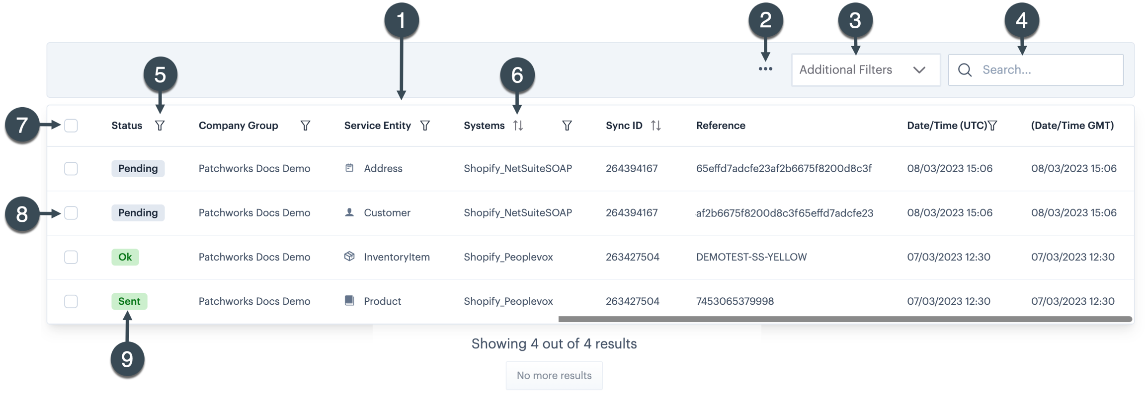 Each time a Patchworks service runs, it is attempting to sync data between source and destination connectors. When this happens, an entry is added to the sync report so you can see - at a glance - every item that has been synced and the outcome (i.e. status) of that operation. The example below highlights key features of this report: