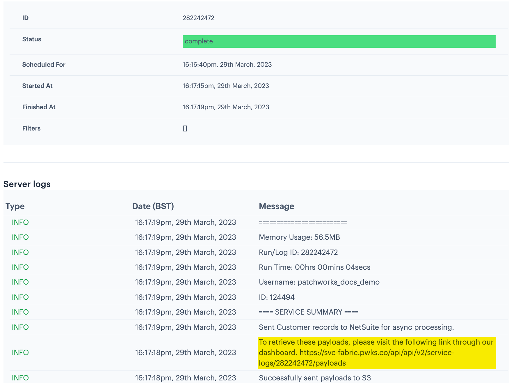 If the service was run manually and you opted to download custom script payloads, a link to generated payloads will be available in this log information. For example: