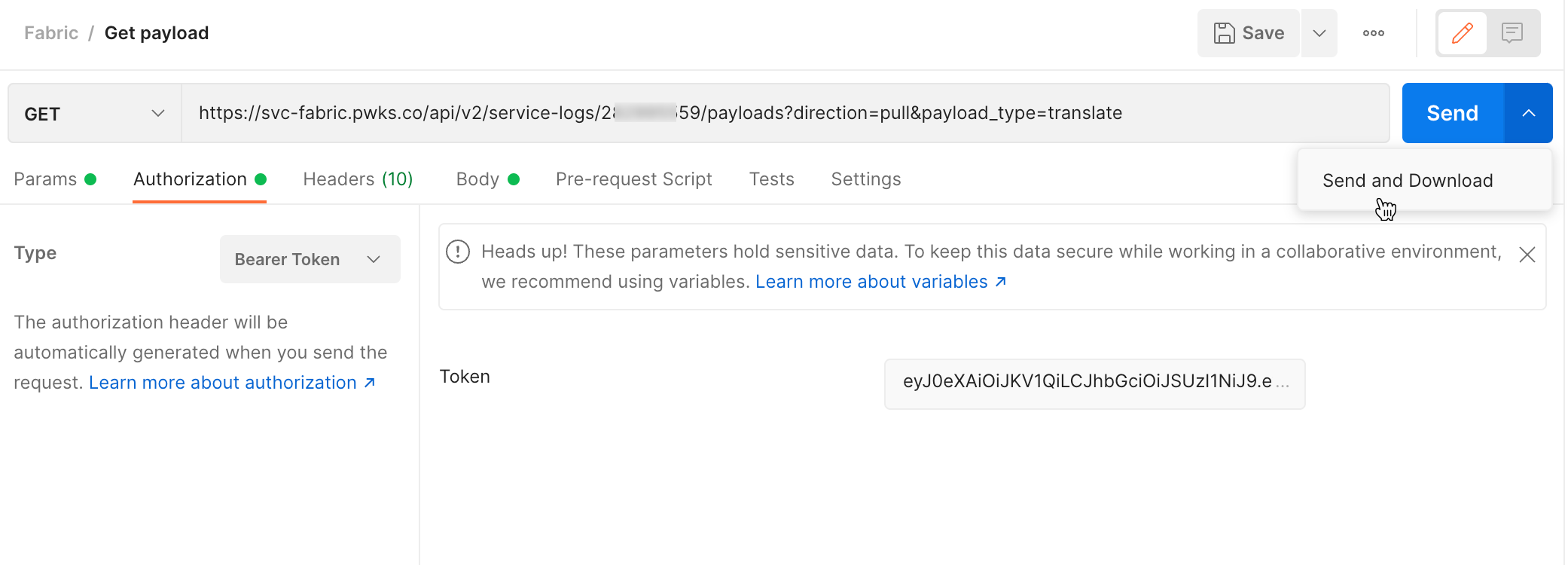 To access these files, you'll need to send a GET request, authenticated with a Patchworks token. A Postman example is shown below: