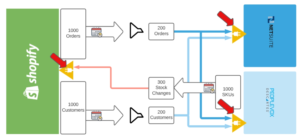 You'll probably need to sync data between these three systems, but you only need to create a single Patchworks connector for each one - then you define services to use these connectors in whatever data flows you need.