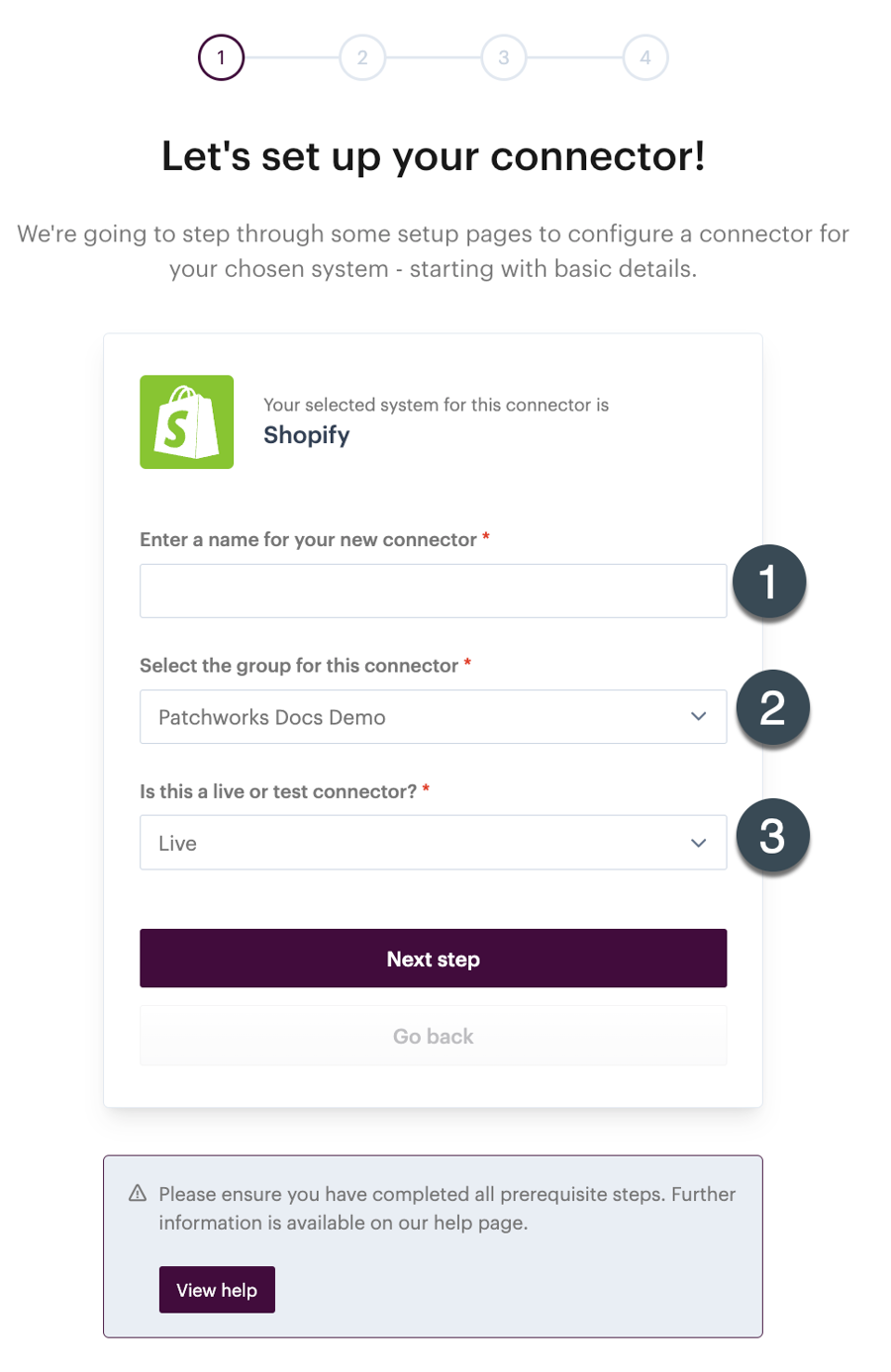 If your company is set up in Patchworks with multiple company groups, use this dropdown list to choose which group this connector is for. You can only have one live and one test connector per system, per company group. If you require multiple live connectors for the same system (for example, you might have three Shopify stores for three different countries) you should ensure that company groups are added to your company profile.