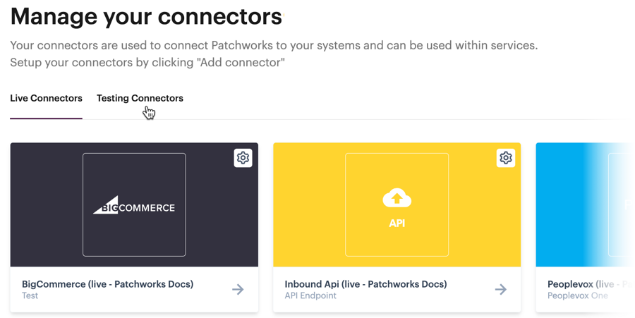 By default, the live connectors tab is displayed and you'll see any existing connectors that you've defined for live system environments. If you also have connectors defined for testing, you can access these via a testing tab - for example: