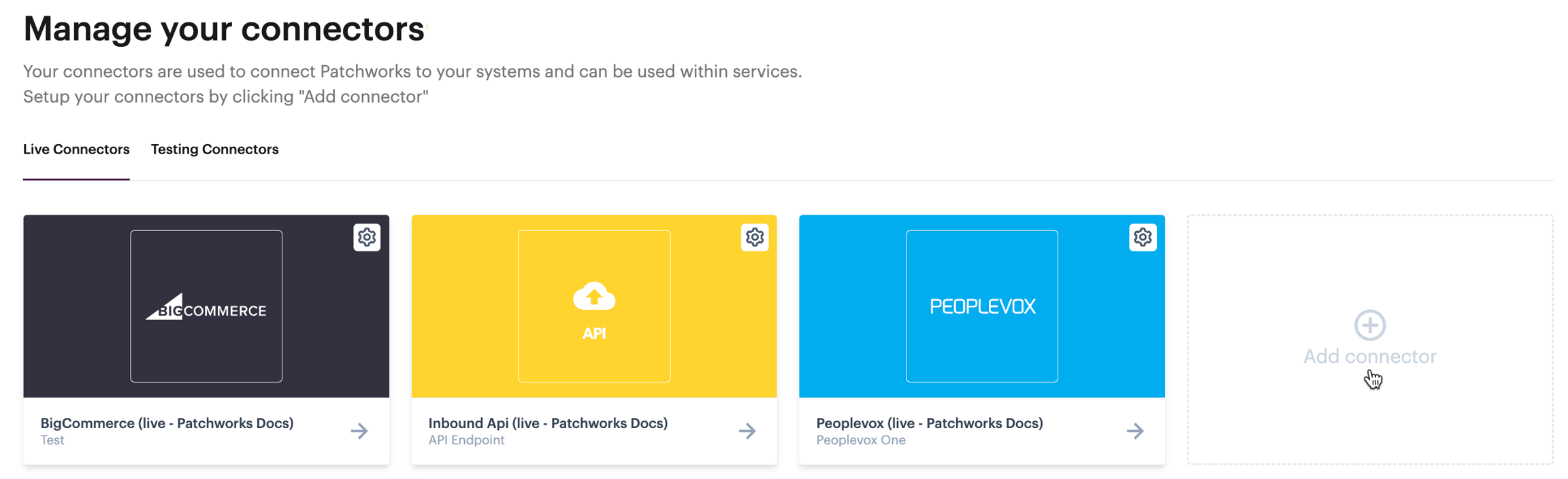 In Patchworks, you can add live and test connectors using our intuitive connector wizard. Before adding a new connector, you will need: