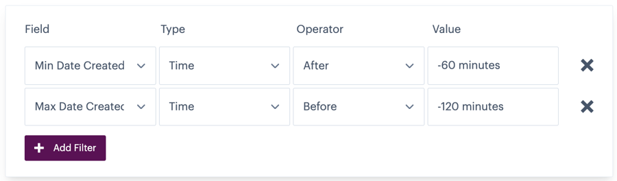 Let's say that we only want to process all orders which are between 1 and 2 hours old. In the Patchworks dashboard, our filters would look as below: