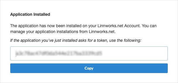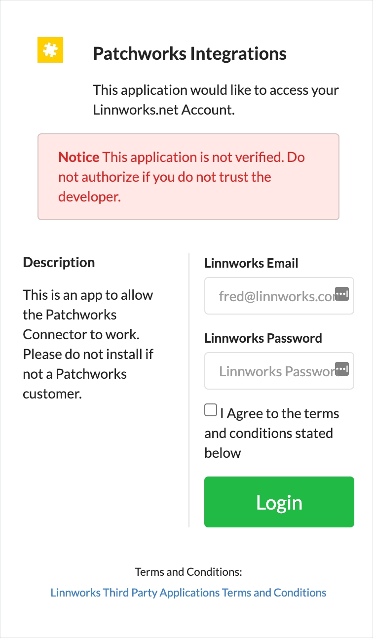 Step 3 Enter your Linnworks credentials, read the terms and conditions and - if you're happy to proceed, click the login button. The Patchworks app is installed on your Linnworks site and a token is displayed - for example: