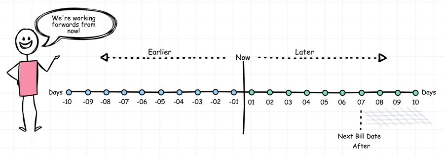 NetSuite also includes a range of time period filters that deal with events that may occur in the future - for example: due date, ship date, expected close date, next bill date, etc. In this scenario, filters are defined to work forwards from 'now'.