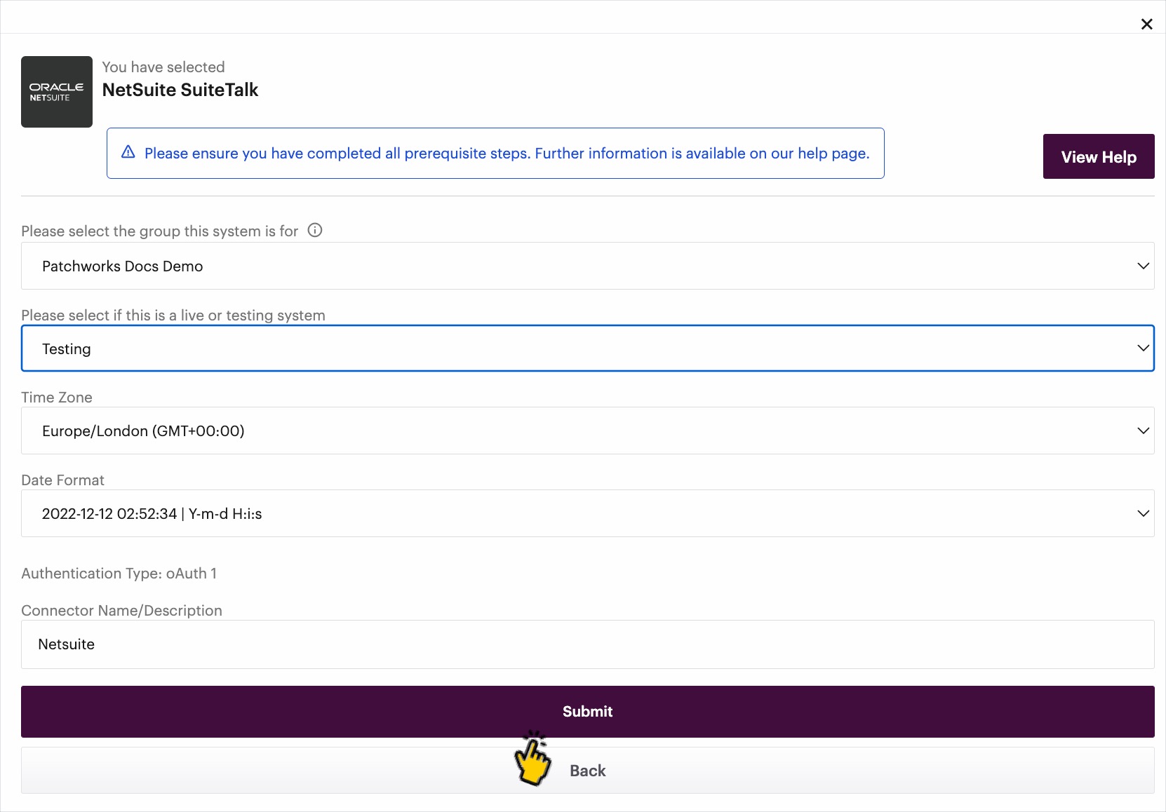 To add a Patchworks [connector](https://doc.wearepatchworks.com/product-documentation/patchworks-services/service-connectors/adding-a-service-connector) for NetSuite, you don't need to enter authentication credentials in the setup form. Instead, you are directed to the NetSuite login page so you can log in and authorise access for Patchworks.