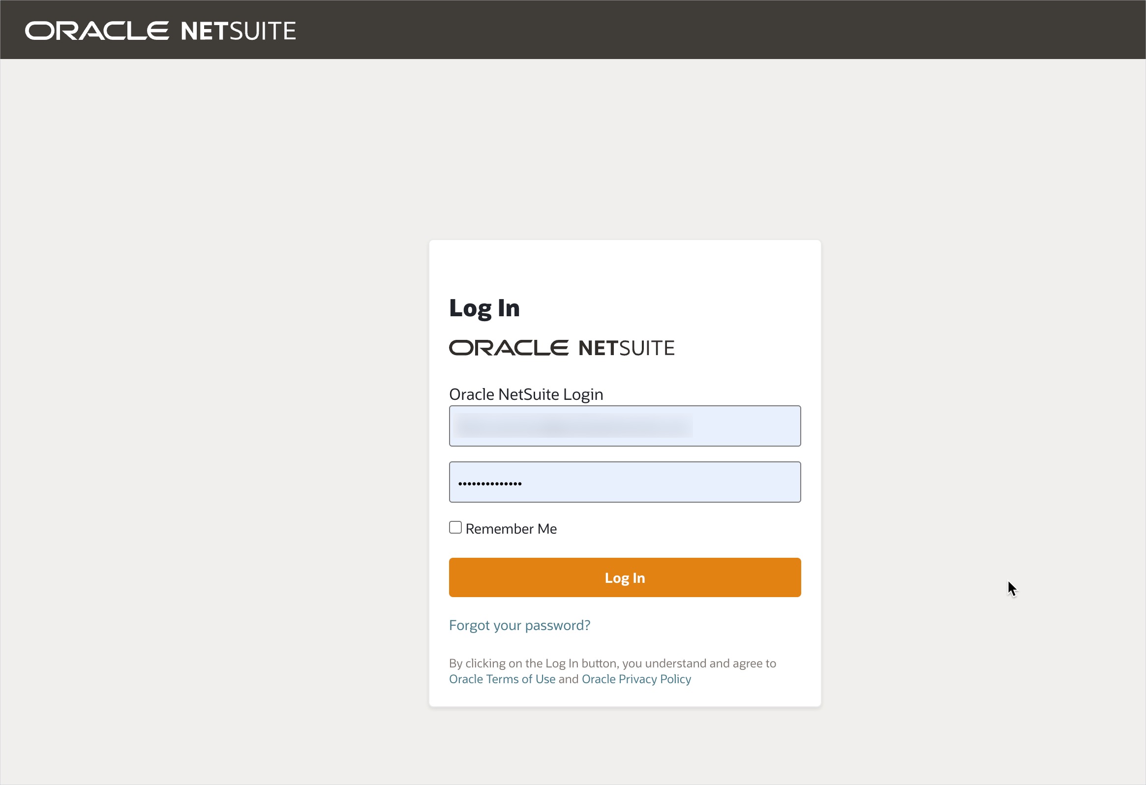 You are directed to an **Oracle NetSuite login page** - log in using your NetSuite account credentials: