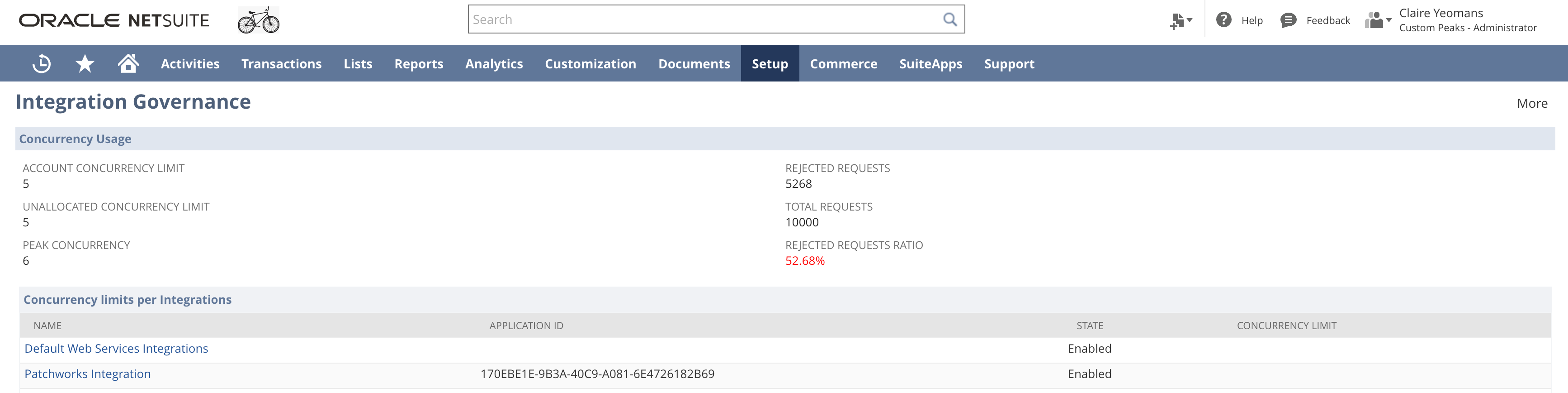 The number of concurrent requests allowed is determined by your NetSuite service tier and your number SuiteCloud licenses. You can view your limits (and set concurrency limits for individual integrations) by navigating to **setup** | **integration** | **integration governance** in Netsuite - for example: