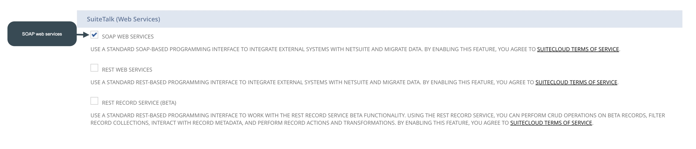 Scroll to the SuiteTalk (Web Services) category and ensure that the SOAP WEB SERVICES feature is ticked: