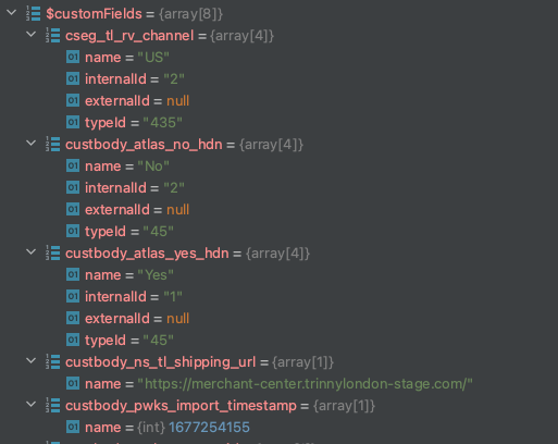 If custom fields are present in a sub array, the format would be the same from that point. In the example below, we show a custom field in the itemList sub array: