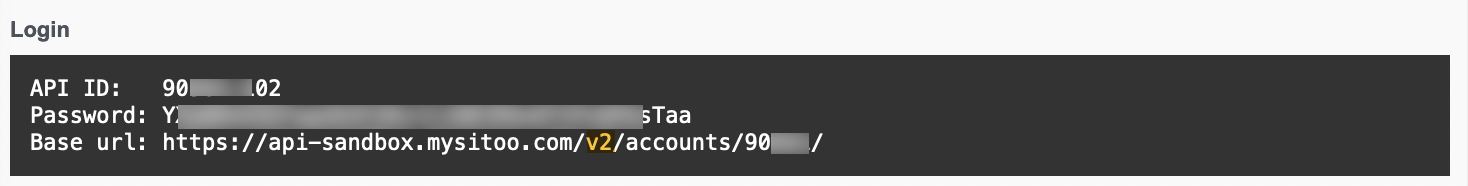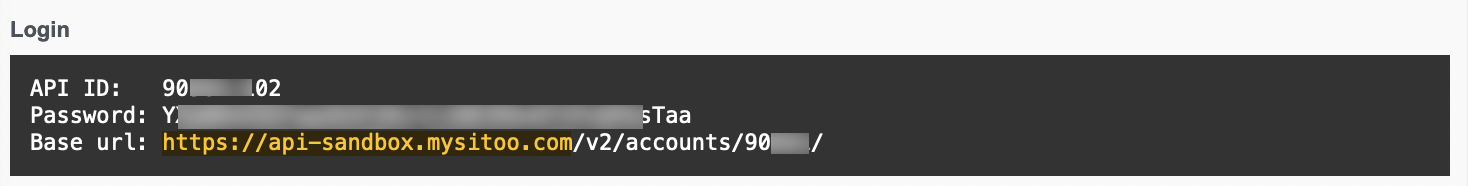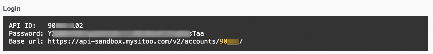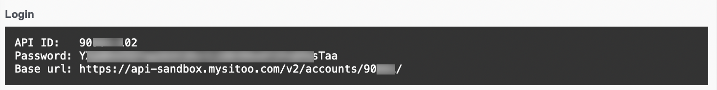 The API ID for your Sitoo instance is displayed within the generated API login page, together with the API URL and API Password.