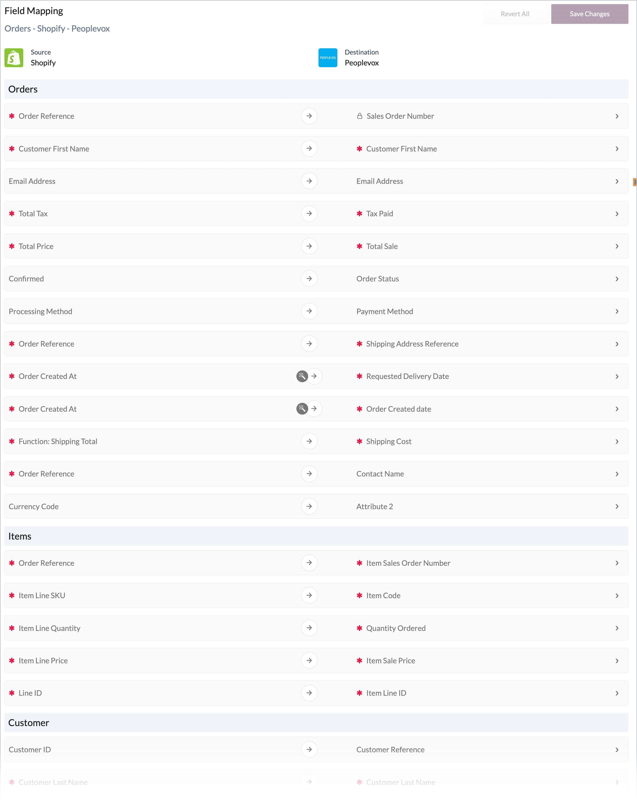 If a mapping row is marked with a red star, it means that at least one half of the mapping is locked for editing because the values are expected by Patchworks.