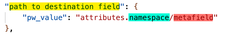 This is where the paths that you noted previously may be needed. Often, you will find that the default mapping file already includes the fields that you require - especially is you are injecting metadata into attribute fields. In this case, all you need to do is update pw_value entries for each metadata item.