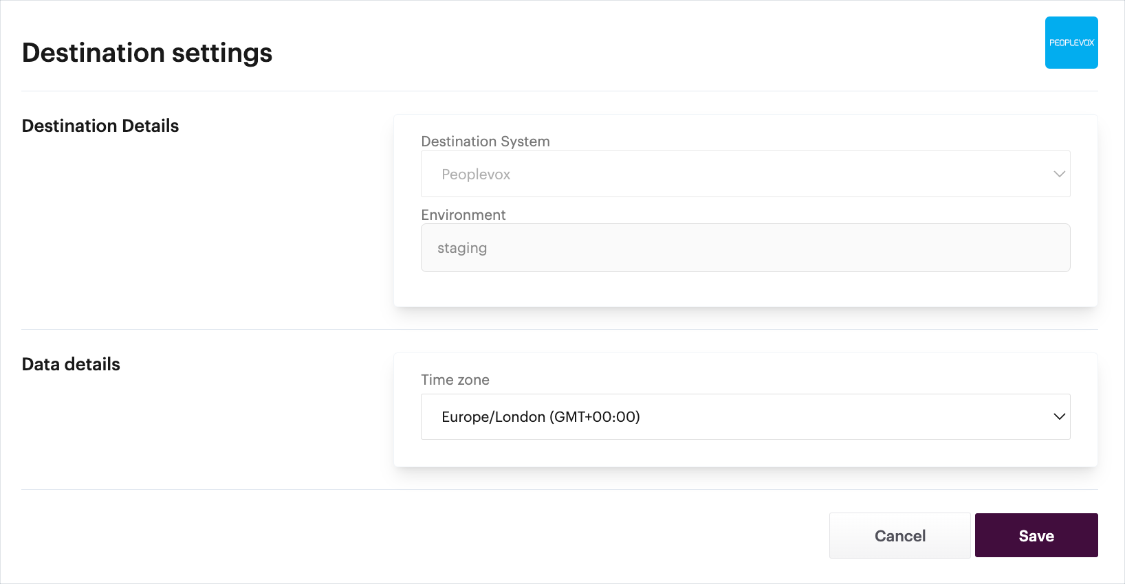 | Destination system | The system that is defined as the destination for this service (e.g. Peoplevox). When this service runs, data is pushed to this system.                                                                                                                                                                                                                                                                                                                                             |