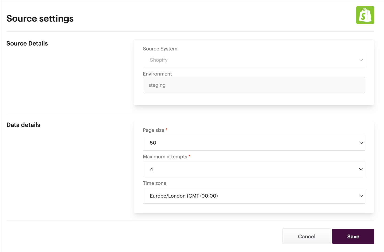 The system that is defined as the source for this service (e.g. Shopify). When this service runs, data is pulled from this system.