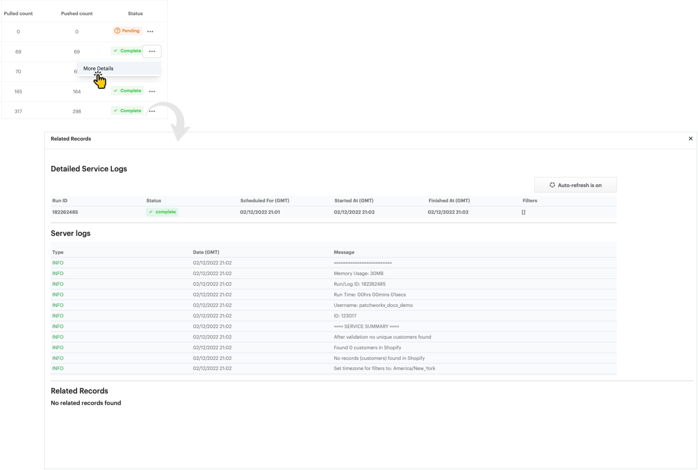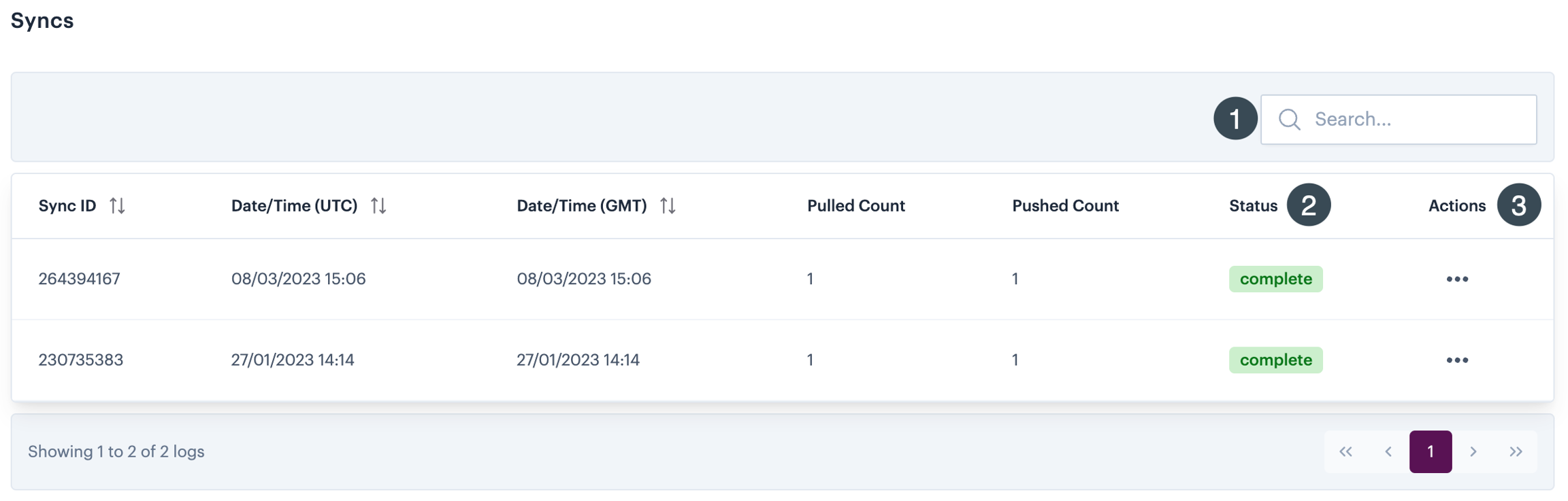 You can use the search field (see 1 above) to find a particular sync entry by its sync id. You can also see the current status (see 2 above) and click the ellipsis (see 3 above) to access more detailed logs.