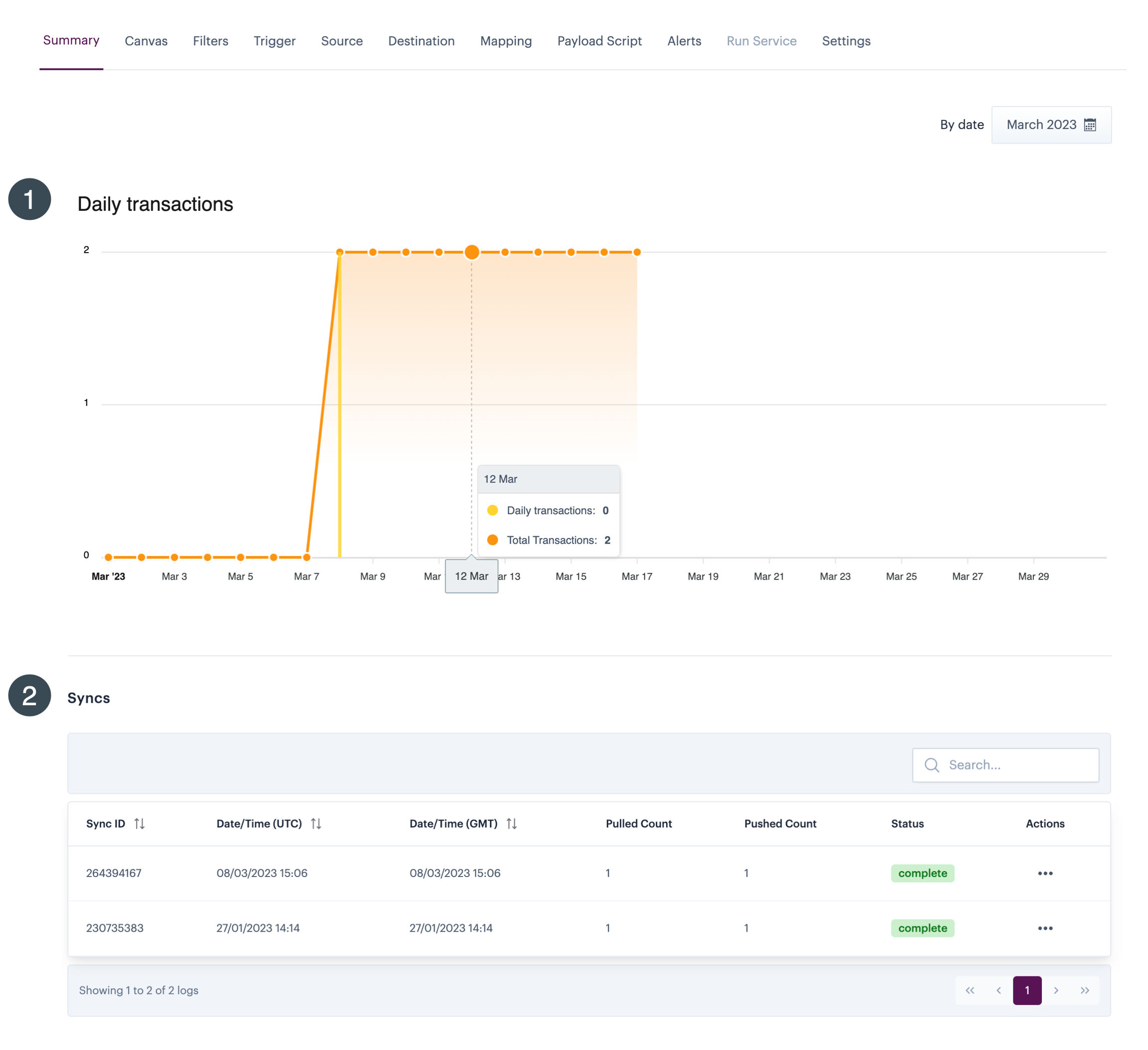 The summary tab shows high-level information about how the service is performing. The tab is split into two panes - daily transactions (see 1 below), followed by a sync list (see 2 below).