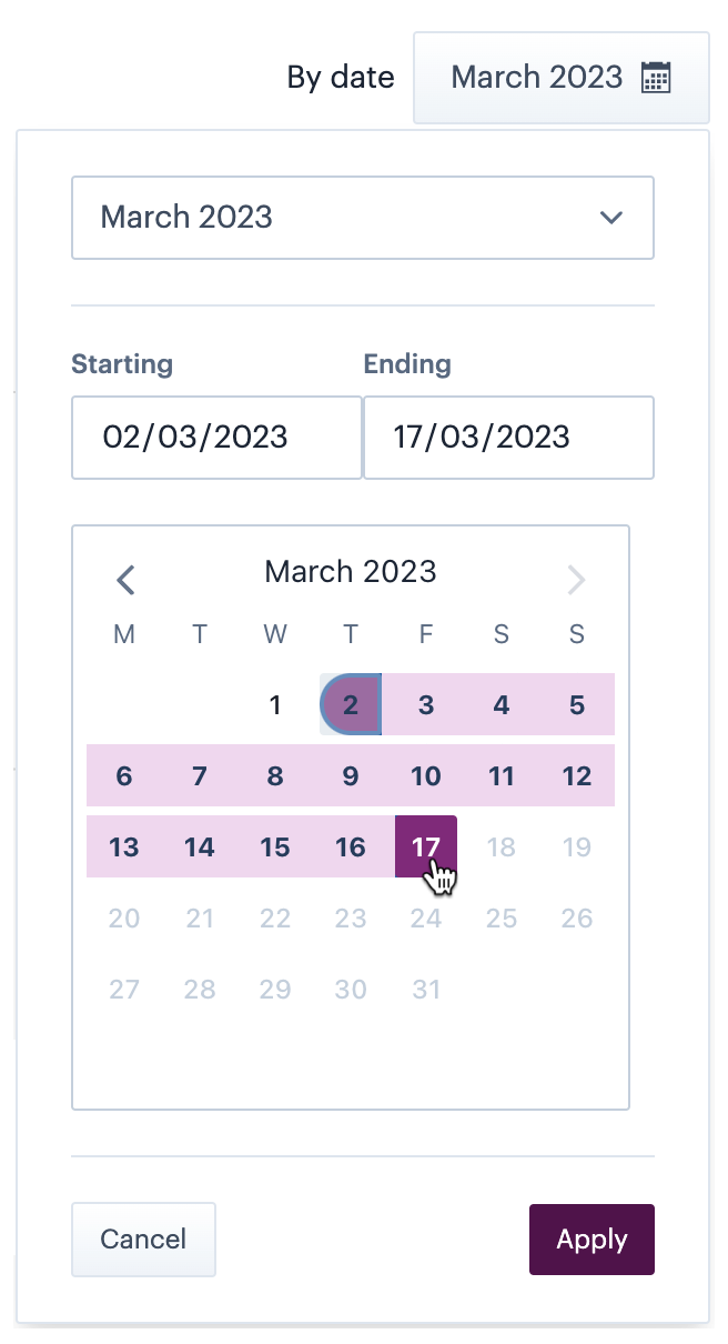 Then click your starting date and move your cursor right/left to select the ending date - for example: