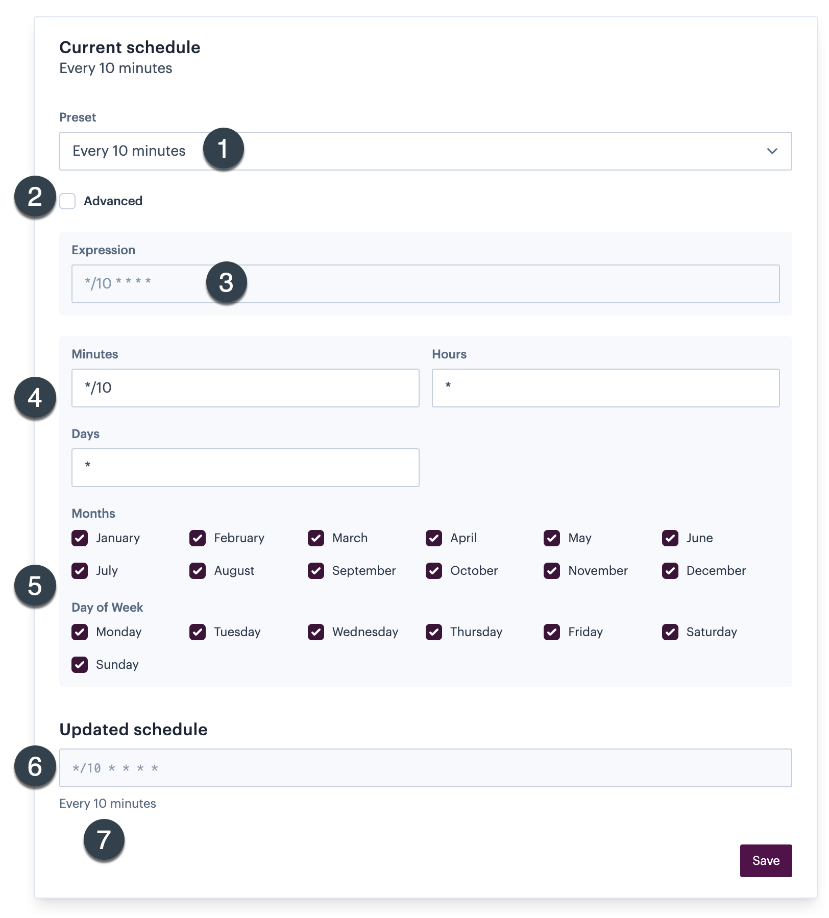 With the advanced checkbox selected, you can enter a regular expression directly. Otherwise, this field updates automatically as you make schedule selections.