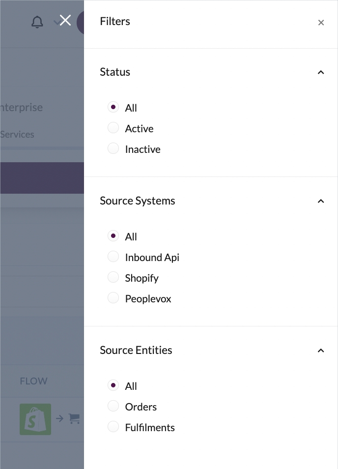 Select this button to open the filters panel and refine the list based on status, source system and source entity selections: