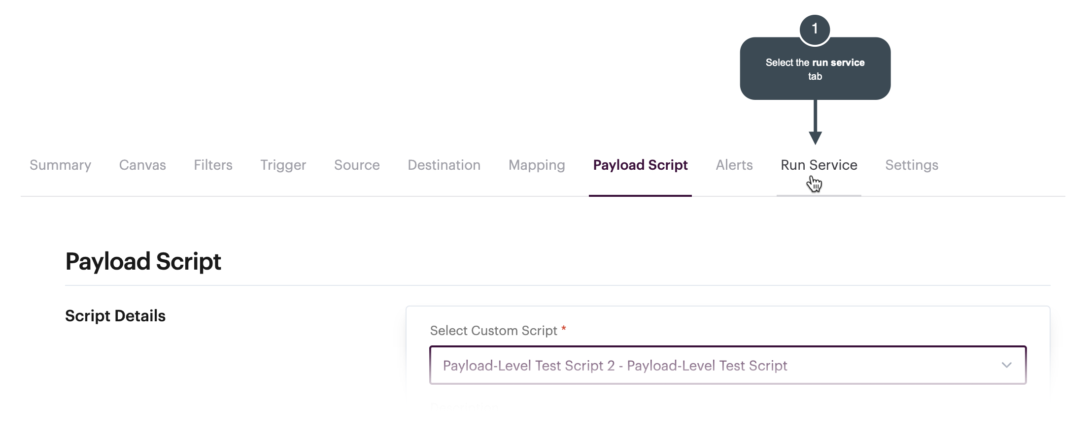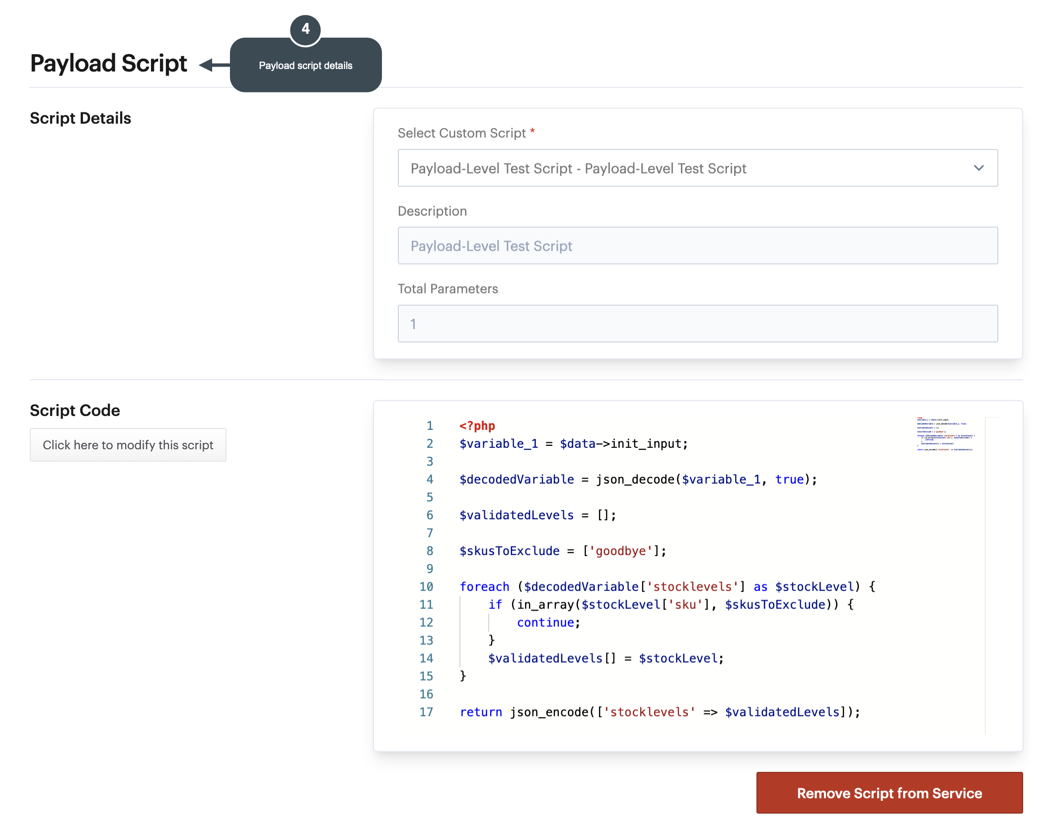 This page explains how to [associate a payload-level custom script with a service](#associating-a-payload-level-script-with-a-service), then [run the service and check input and output payloads](#running-the-service-and-checking-payloads).