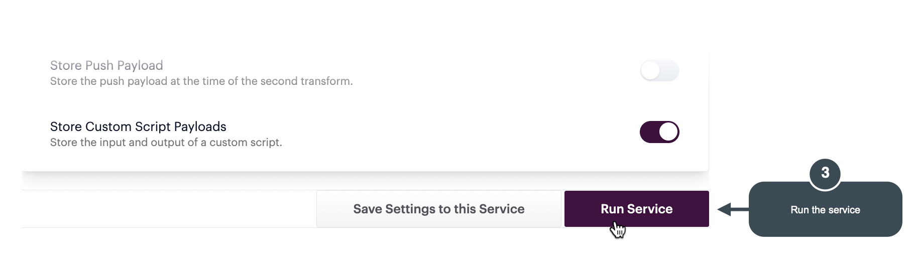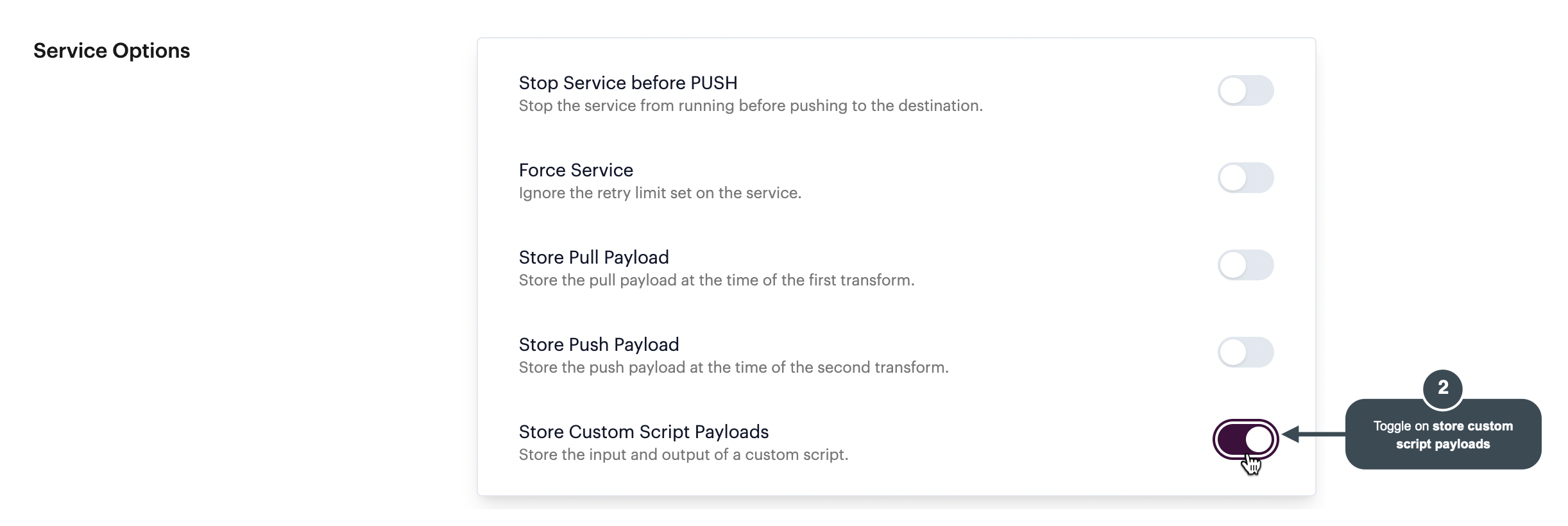 Scroll down to the **service options** section and toggle on the **store custom script payloads** setting: &#x20;