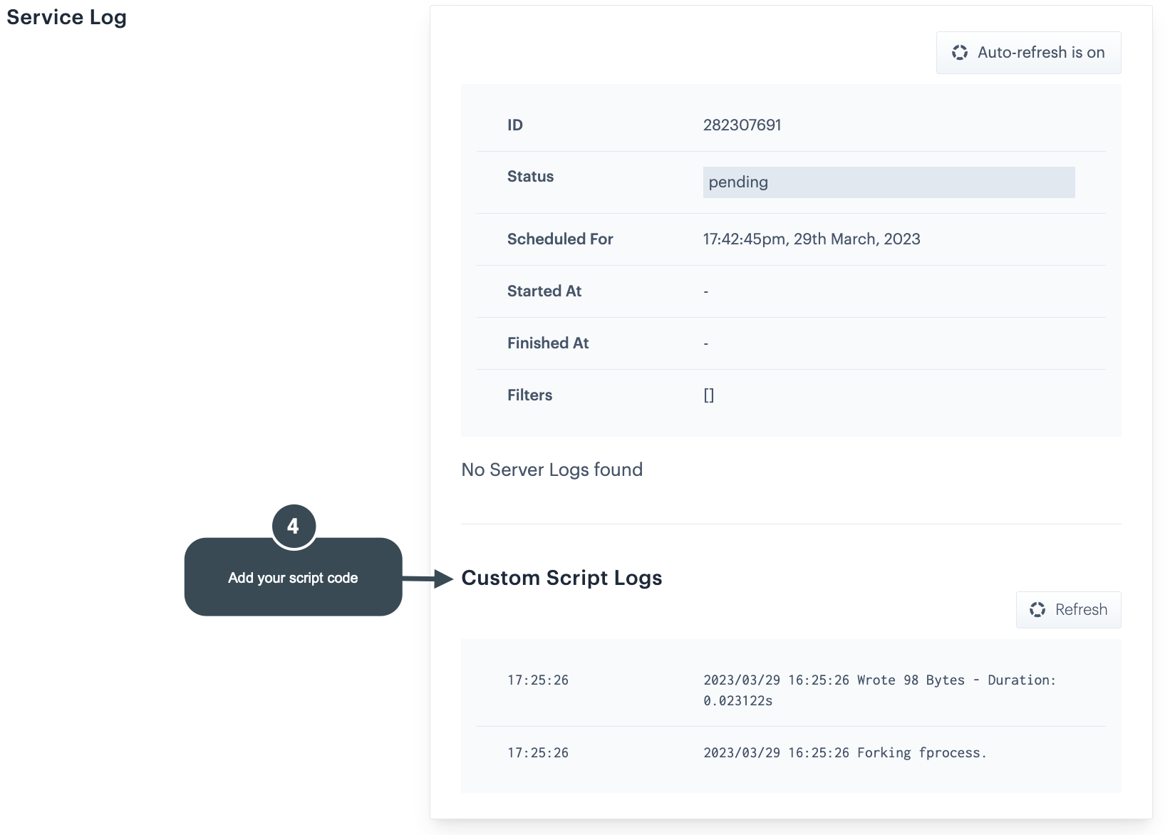 <figure><img src="https://content.gitbook.com/content/5mpqoXPMbUuPa8JpCLWe/blobs/ZQGopSJobmImeT5P3NTq/custom%20script%20logs%20from%20service.png" alt=""><figcaption></figcaption></figure>