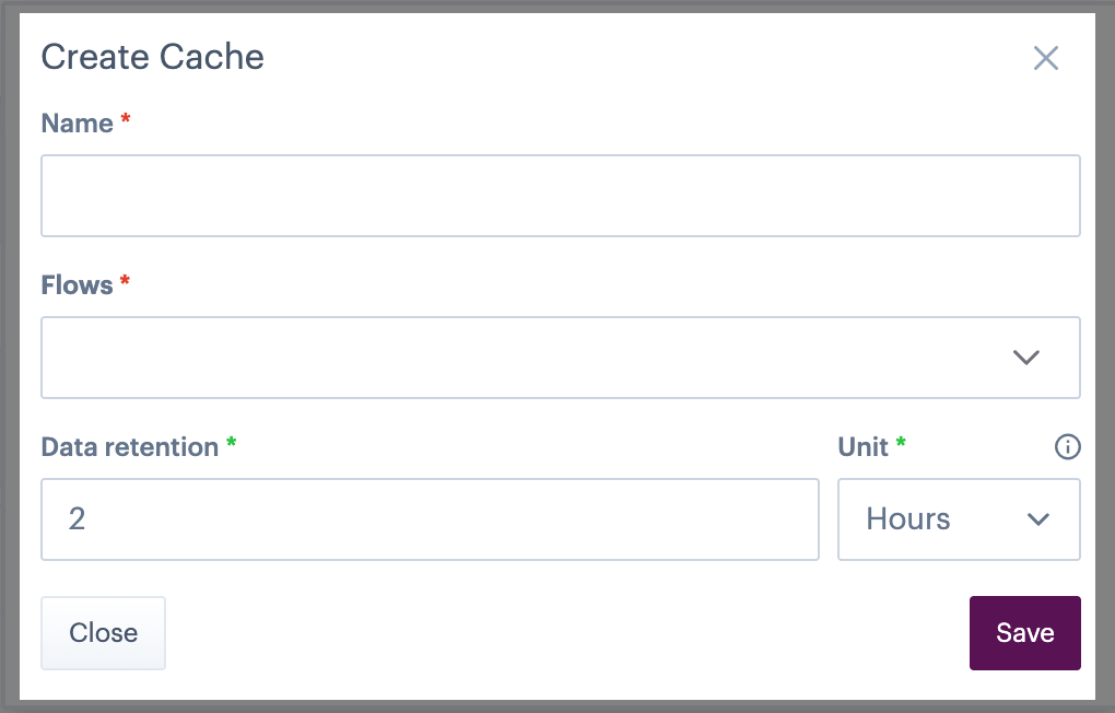 If you choose to create a flow or flow run cache, the following details are required: