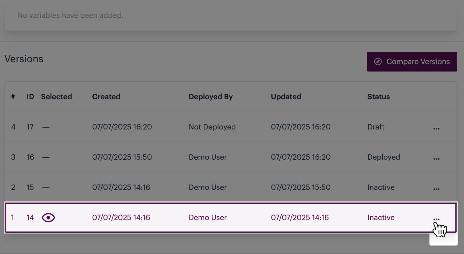 Click the ellipsis icon associated with the `inactive` version that you want to remove, for example:
