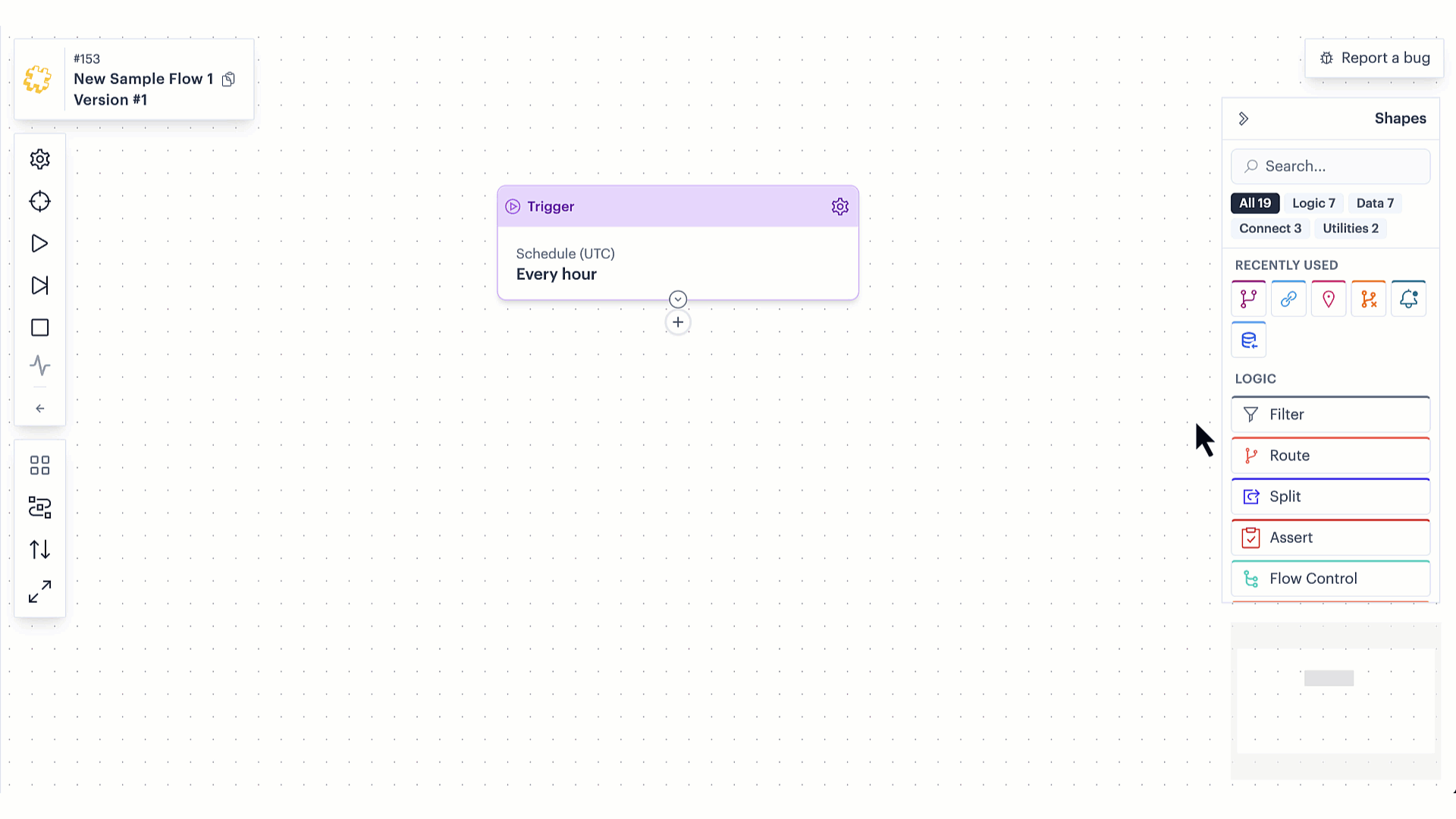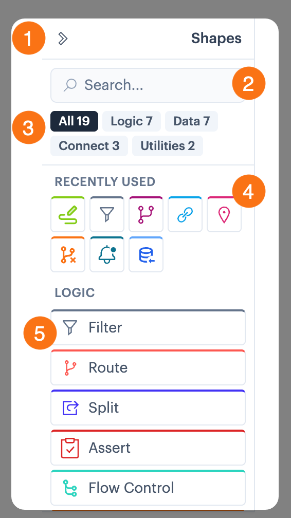 <table><thead><tr><th width="88.55859375">#1</th><th>Summary</th></tr></thead><tbody><tr><td>1</td><td>Collapse the shapes panel.</td></tr><tr><td>2</td><td>Use the <code>search</code> field to search by shape name (the search is not case sensitive).</td></tr><tr><td>3</td><td>Shapes are categorised into <code>logic</code>, <code>data</code>, <code>connect</code>, and <code>utilities</code> groupings. Select a category to view applicable shapes.</td></tr><tr><td>4</td><td>Drag from your most recently used shapes.</td></tr><tr><td>5</td><td>Scroll listed shapes and drag to the canvas.</td></tr></tbody></table>