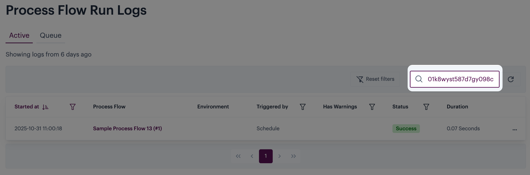 If you're looking for a specific log, you can use the search field to search by `flow run id` or by process flow name: