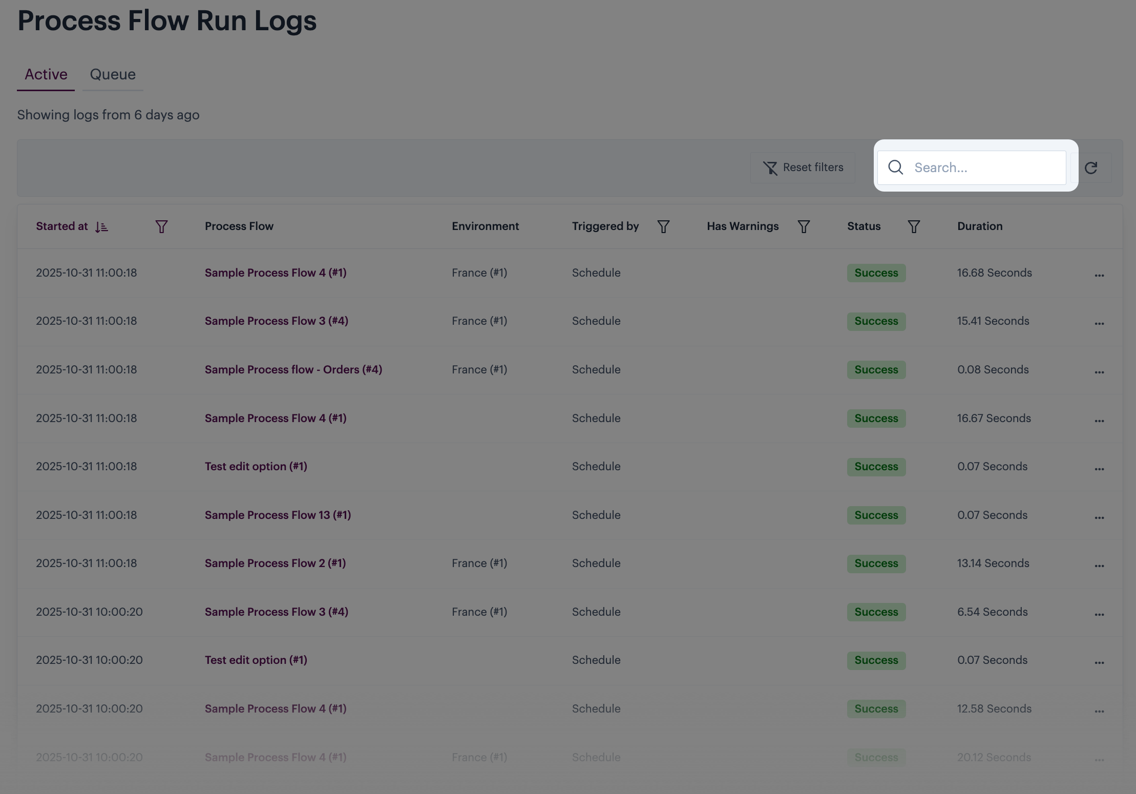 If you want to find logs for a process flow that you only know by name, type any part of the name into the `search` field - for example: